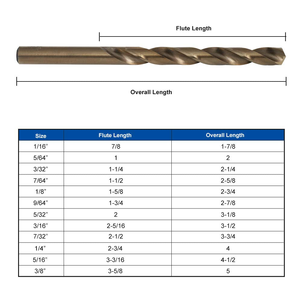 - SIZE INCLUDED: 15pcs jobber length drill bit set with plastic storage case including sizes:1/16" 2pc,5/64" 1pc ,3/32" 2pc,7/64" 1pc,1/8" 2pc ,9/64" 1pc, 5/32" 1pc, 3/16" 1pc, 7/32" 1pc, 1/4" 1pc, 5/16" 1pc, 3/8" 1pc.