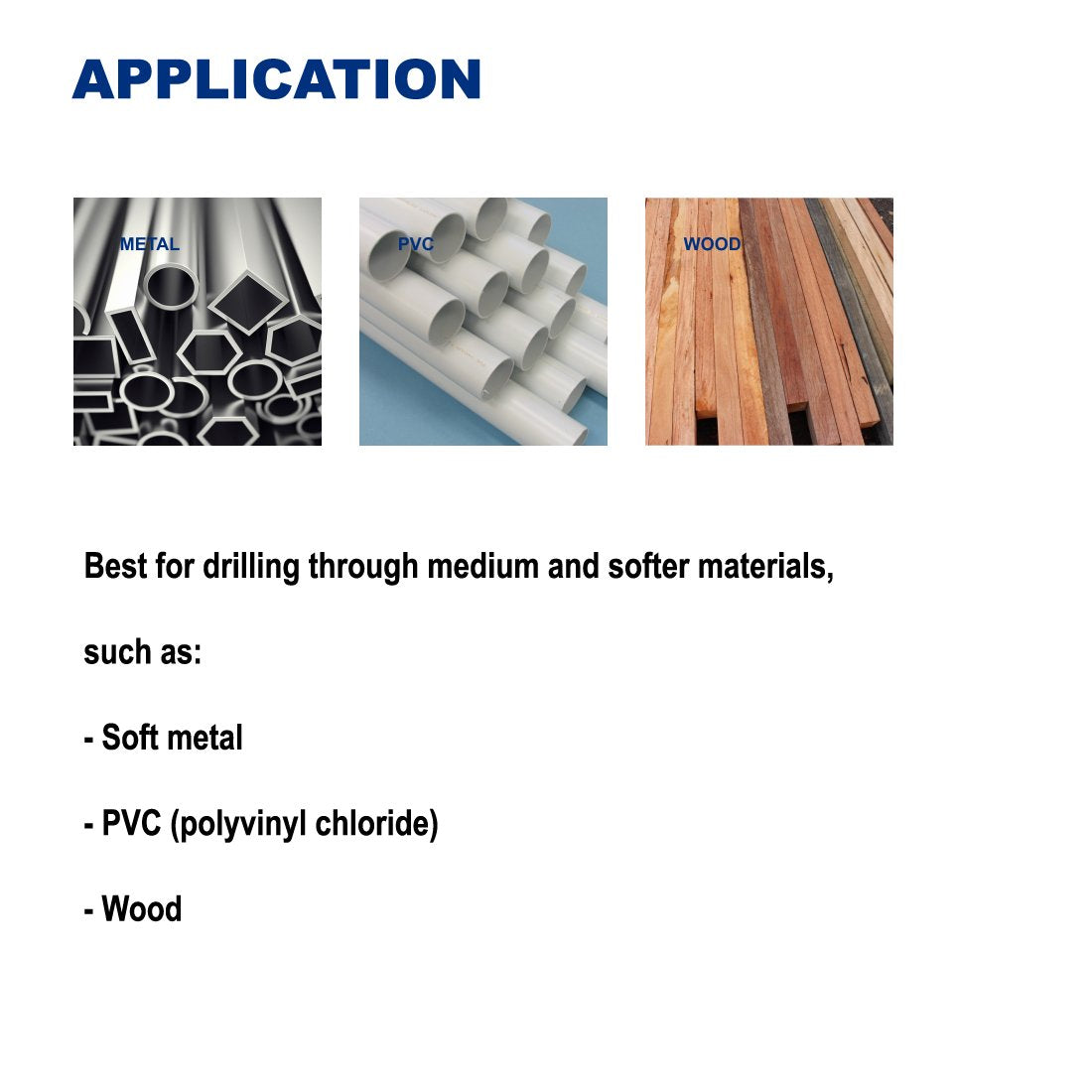 - APPLICATION: offer best durability and speed for repetitive drilling in medium and softer materials, soft metal, PVC and wood