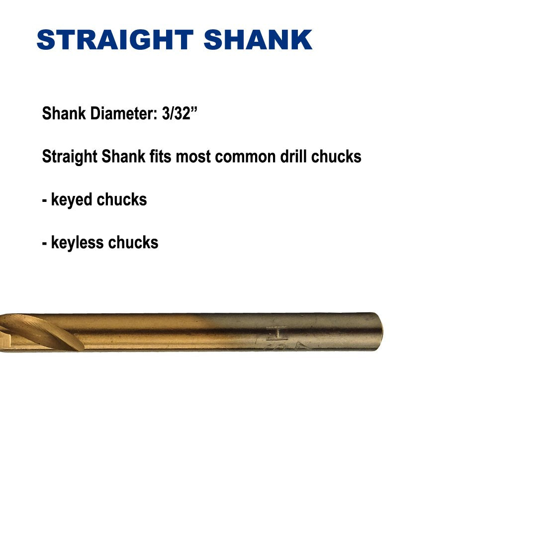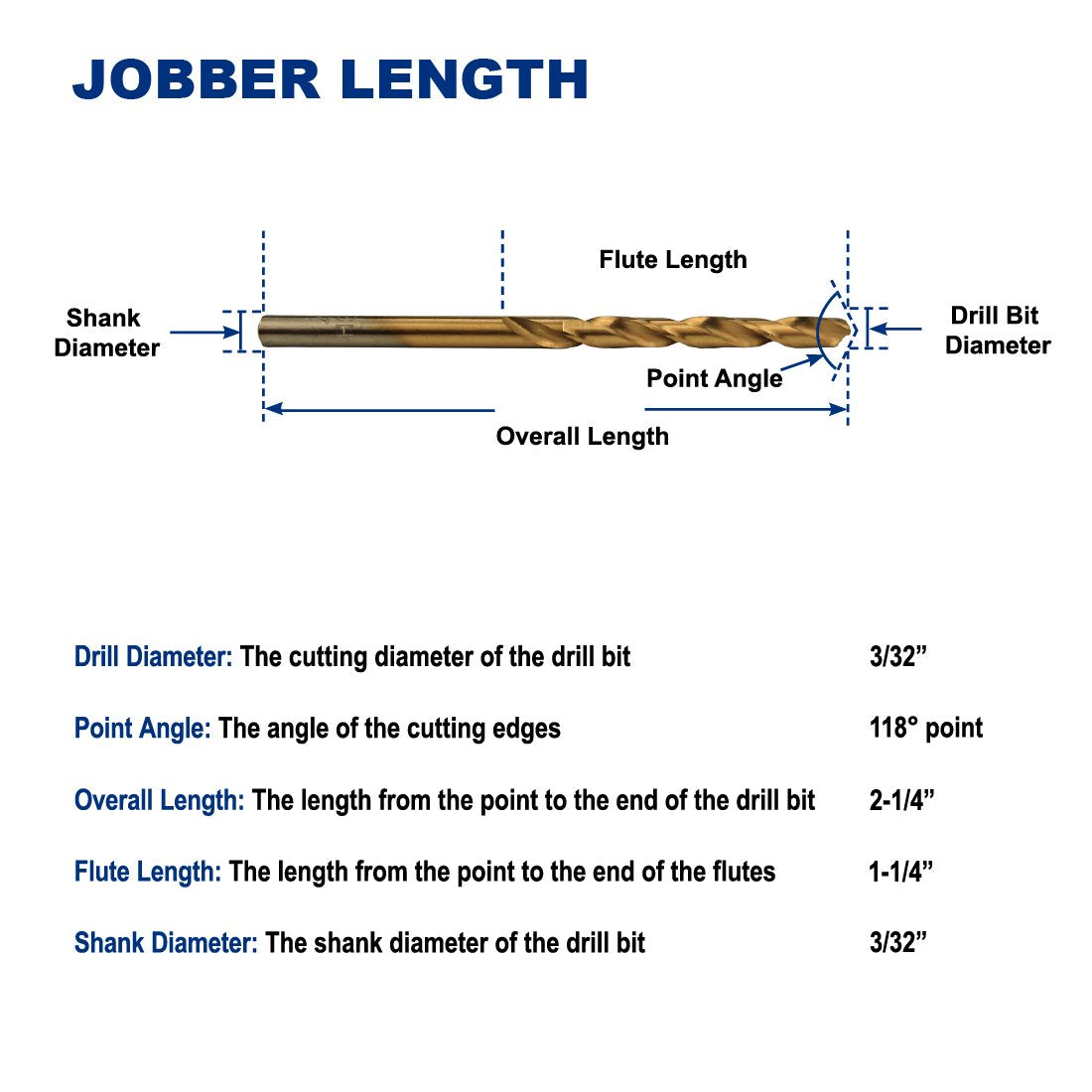 - JOBBER LENGTH: 3/32-Inch cutting diameter, 1-1/4-Inch flute length, 2-1/4-Inch overall length, 118 degree point, straight shank