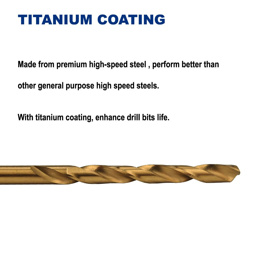 amoolo Titanium Drill Bit Set (60 pcs), Premium 4341 HSS Micro Drill Bits for Wood, Metal, Steel, Plastic, Aluminum Alloy, 3/64"-1/8" Key Featurers Hard & Durable Industry grade 4341 high speed steel (HSS) twist drill bit set, harder than 4241 HSS Precise Performance 135°Split Point with straight shank prevents walking and makes drilling pre...