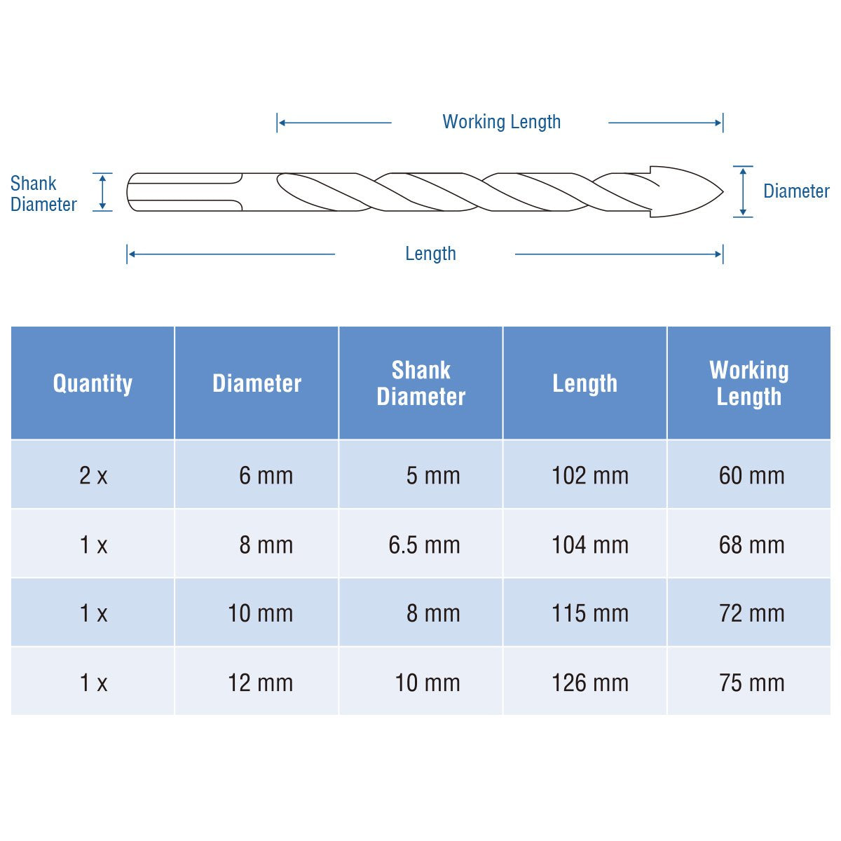 - 3) 5 Pcs drill bit set with 4 different sizes: 2x 6mm(1/4"), 1x 8mm(5/16"), 1x 10mm(3/8"), 1x 12mm(1/2")