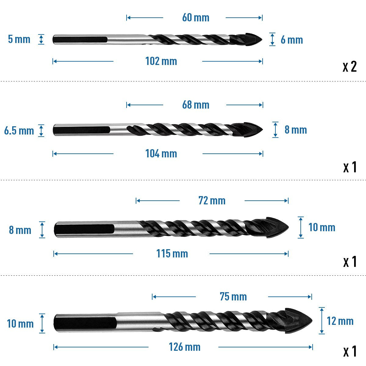 QWORK 5 Pcs Set (6, 6, 8, 10, 12mm) Multi-Material Drill Bit Set for Tile,Concrete, Brick, Glass, Plastic and Wood Tungsten Carbide Tip Best for Wall Mirror and Ceramic Tile on Concrete and Brick Wall 5 Pcs Set (6, 6, 8, 10, 12mm)