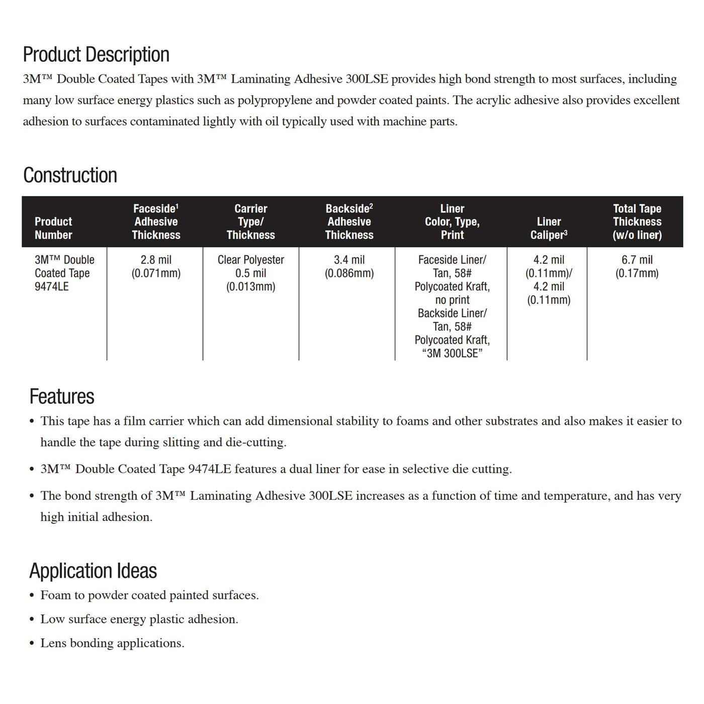 - CONSTRUCTION: The double sided tape/sheet 9474LE uses adhesive type 3M 300LSE, and it is constructed with three layers. One ultrathin polyester film carrier coated on both sides with 300LSE adhesive. This tape can provide dimensional stability to soft materials like foams.
