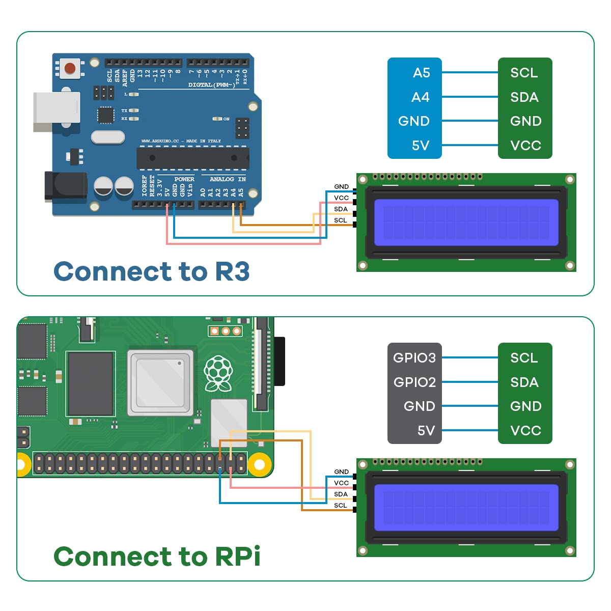 Specifications: Display: 2-lines x 16-characters Four Pin Definition: GND, VCC, SDA, SCL Default I2C bus address: 0 x 27 for F8574T chip Working voltage: 5V Adjust Backlight: Potentiometer Package includes: 3 x LCD display 1 x 10pin F-M jumper wires