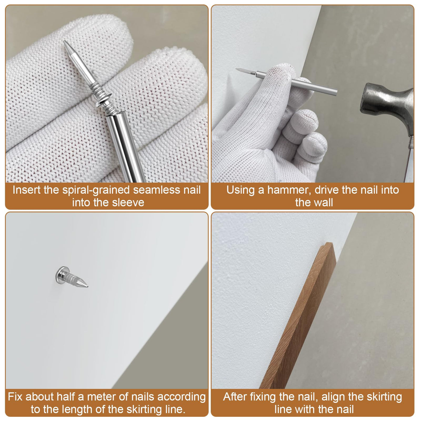 - Seamless nails for skirting lines Our double-ended seamless nails are tailor-made for interior decoration. These seamless nails make the skirting board tightly connected to the wall, without any nails on the surface, strong and beautiful.