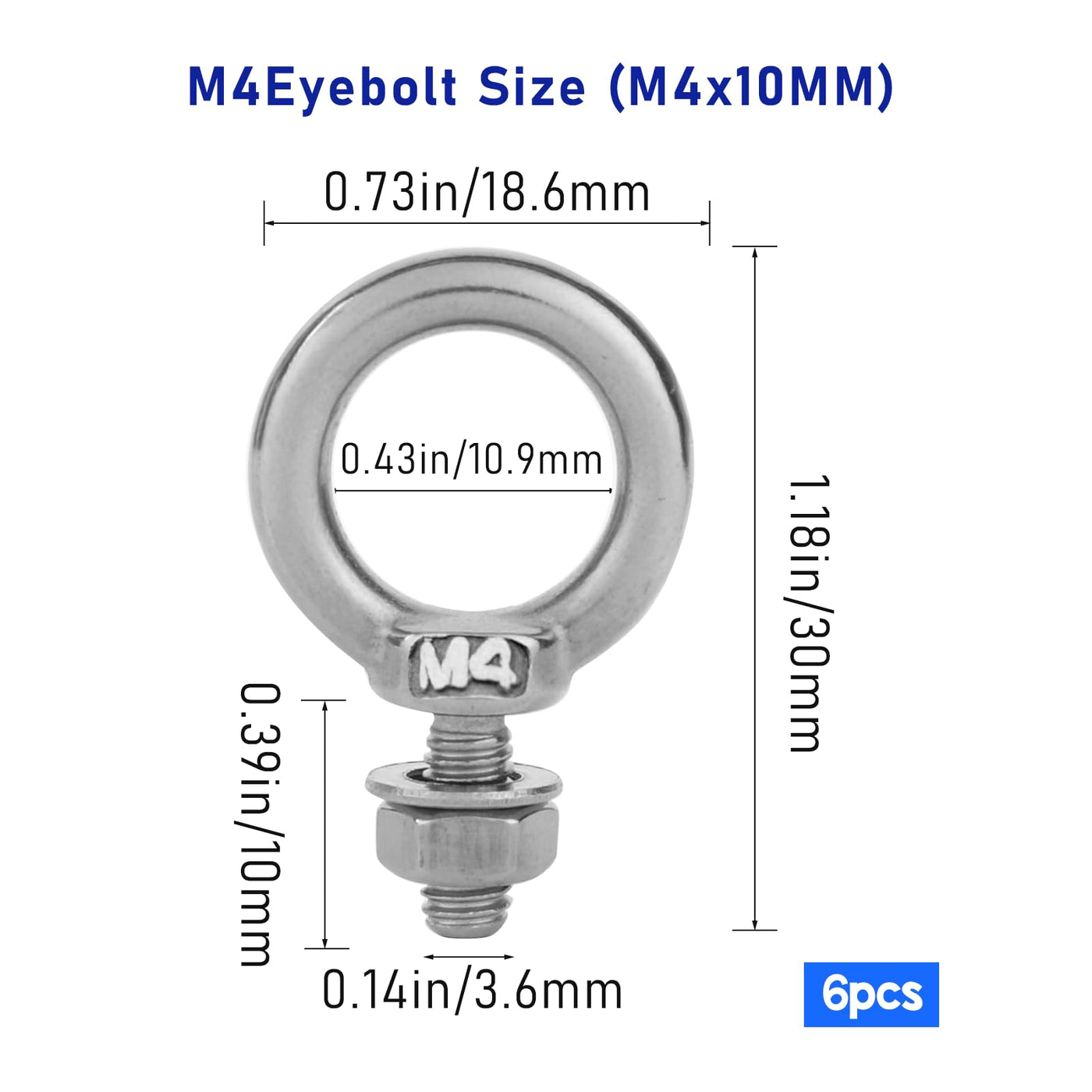 • M4 Thread Eye Bolt - The screw thread diameter of the M4 eyebolt measures 4mm/0.16inch, and the eyebolts thread shank length is about 10mm/0.39inch.