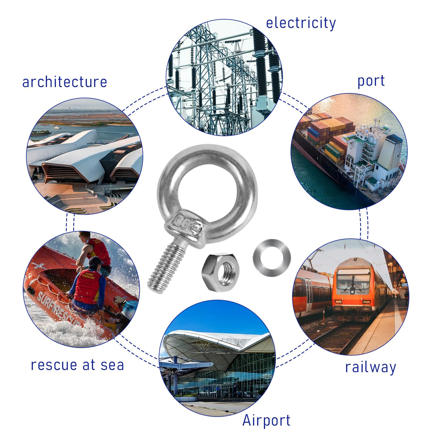 • Wide Application: The eye bolts is ideal for suspending string lights, illuminating fixtures, and ornaments. It functions as a wire rope, clothesline, or chainlink fence hanger.