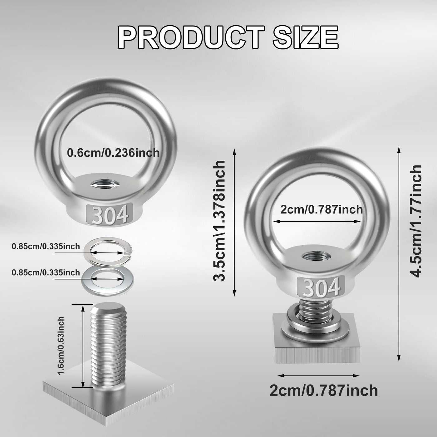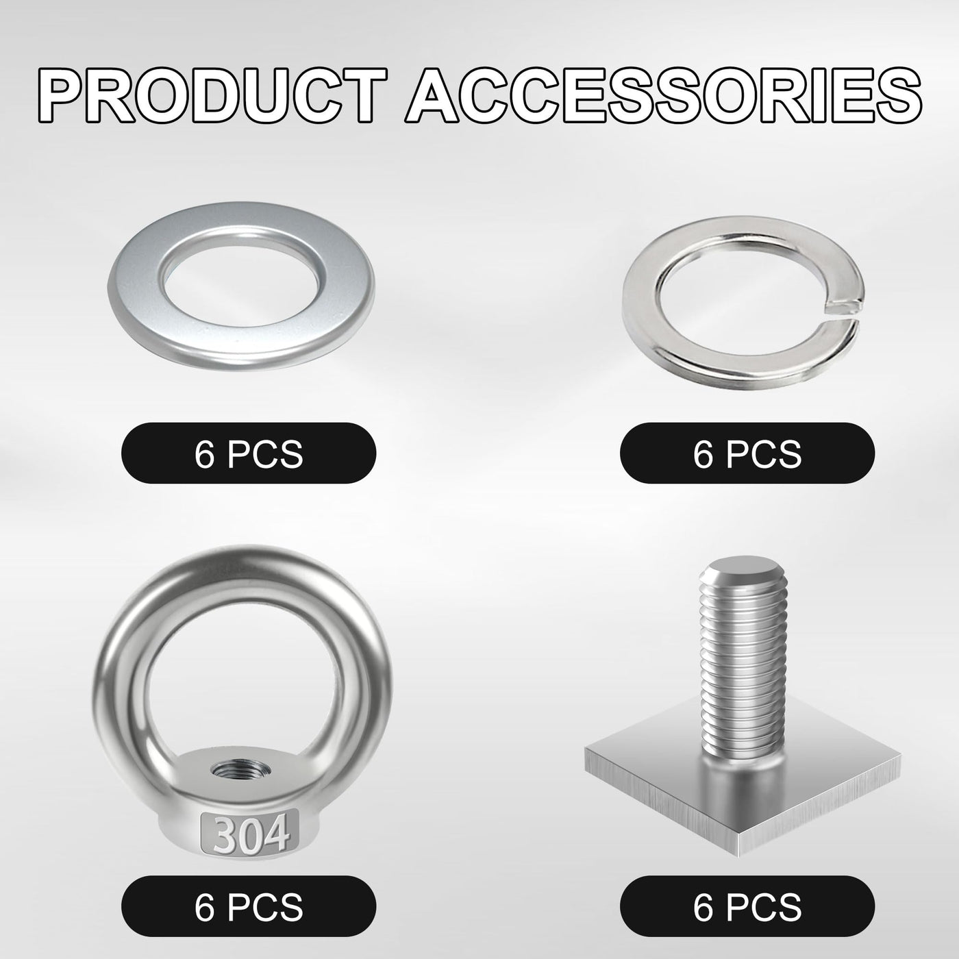 - WHAT YOU GET: Each pack contains 6 pieces of eye bolts, 6 pieces of stainless steel slot nuts, 6 pieces of stainless steel washer, 6 pieces of stainless steel spring washer, providing an ample supply for multiple projects, replacements, or spares. With this Nuts and Lifting Eye Bolts pack, you'll always have the right quantity of eye nuts on hand for your anchoring needs