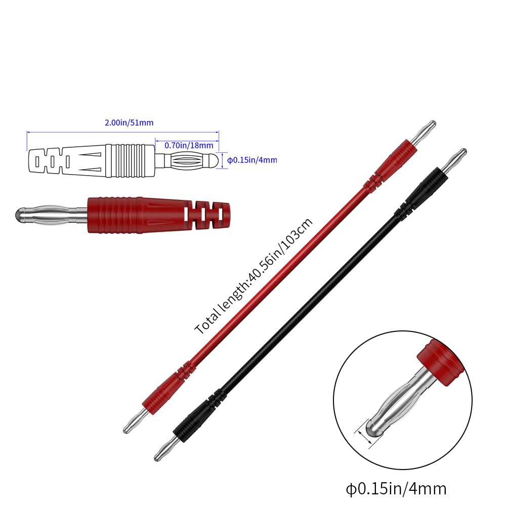 - Test Leads: 2pcs test leads with both ends 4mm banana plug , the length is 100cm, the outer diameter of the wire is 2.8mm, suitable for 4mm digital multi-meter, or any other 4mm female banana socket. Perfect for testing or any electrical quick connection.