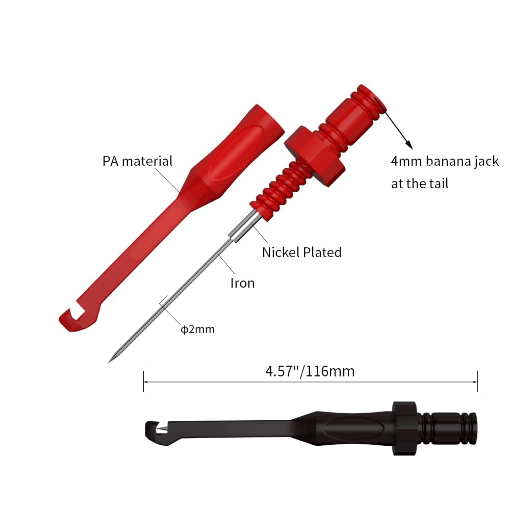 - Test Probes: 2pcs wire piercing probe, they can test the wire without strip or damage the wire. 11.6cm long Non-Destructive Wire-Piercing Back Probe Pins with 4MM Jack