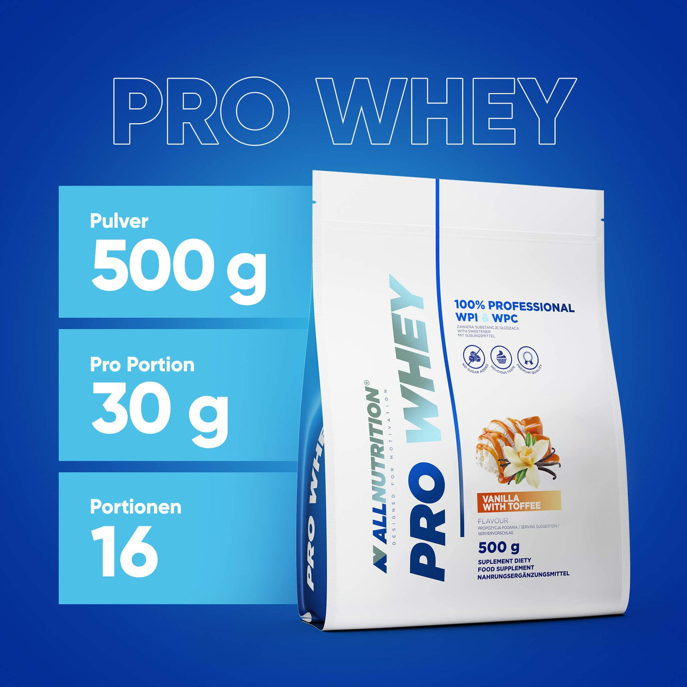 ALLNUTRITION Pro Whey Protein Powder with Branched Amino Acids - Whey Protein Concentrate & Whey Protein Isolate - Pre-Workout Powder - Low Calorie Protein Powder - 500g - Vanilla with Toffee