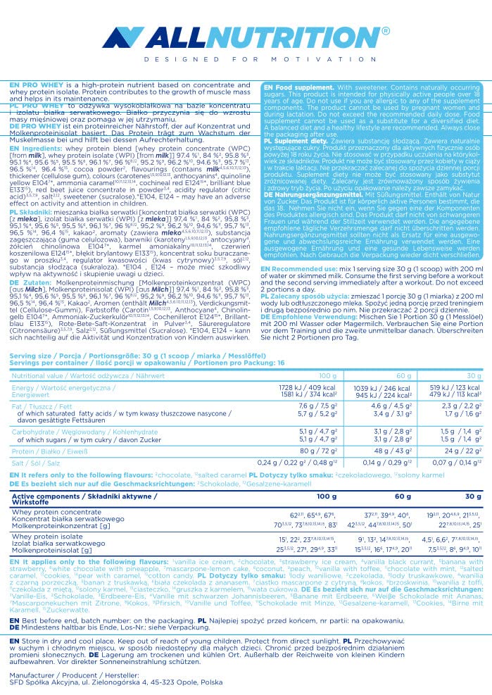 Allnutrition Pro Whey Protein Powder With Branched Amino Acids - Whey Protein Concentrate & Whey Protein Isolate - Pre-Workout Powder - Low-Calorie Protein Powder - 500 G - Vanilla With Toffee