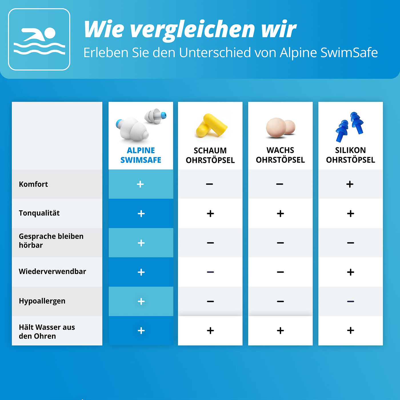 - WATERPROOF PROTECTION Do you like swimming but want to keep your ears dry? Our SwimSafe earplugs with AlpineThermoShape material are comfortable to wear and keep water out.