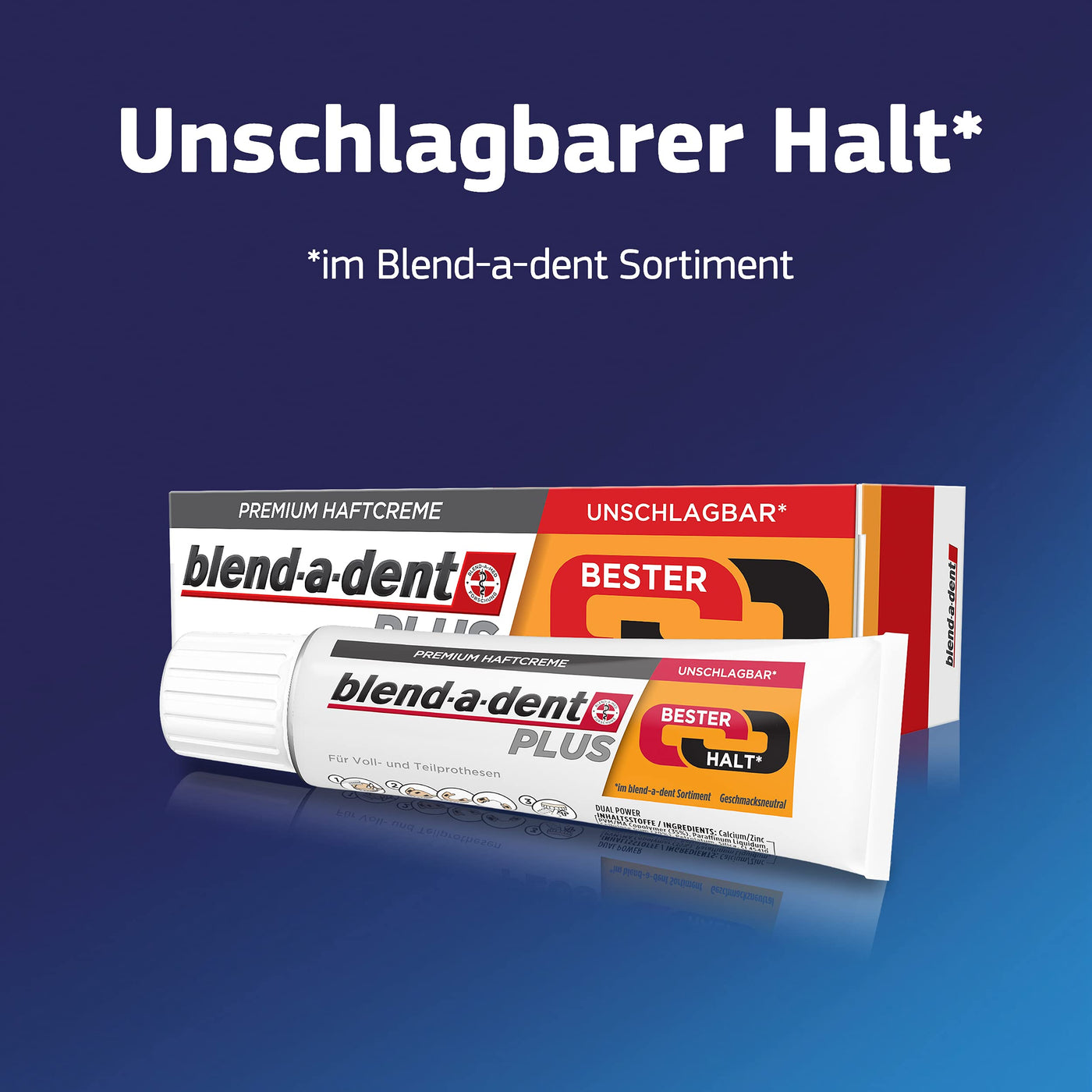 Enjoy even hard, difficult-to-eat foods thanks to the strong Blend-a-dent Plus Best Hold Premium Adhesive Cream . The best hold within the Blend-a-dent range. Thanks to the unbeatable hold and the concentrated formula that continuously releases adhesive, with Blend-a-dent Plus Best Hold you reach the end of the day with an excellent 88% of the original holding power. The adhesive cream also provides ten times stronger hold compared to using without adhesive cream, so your dentures always stay securely in place and you can enjoy any type of food. Blend-a-dent Plus Best Hold is equipped with a dosing tip for easy application, has no taste and does not affect the taste of food.