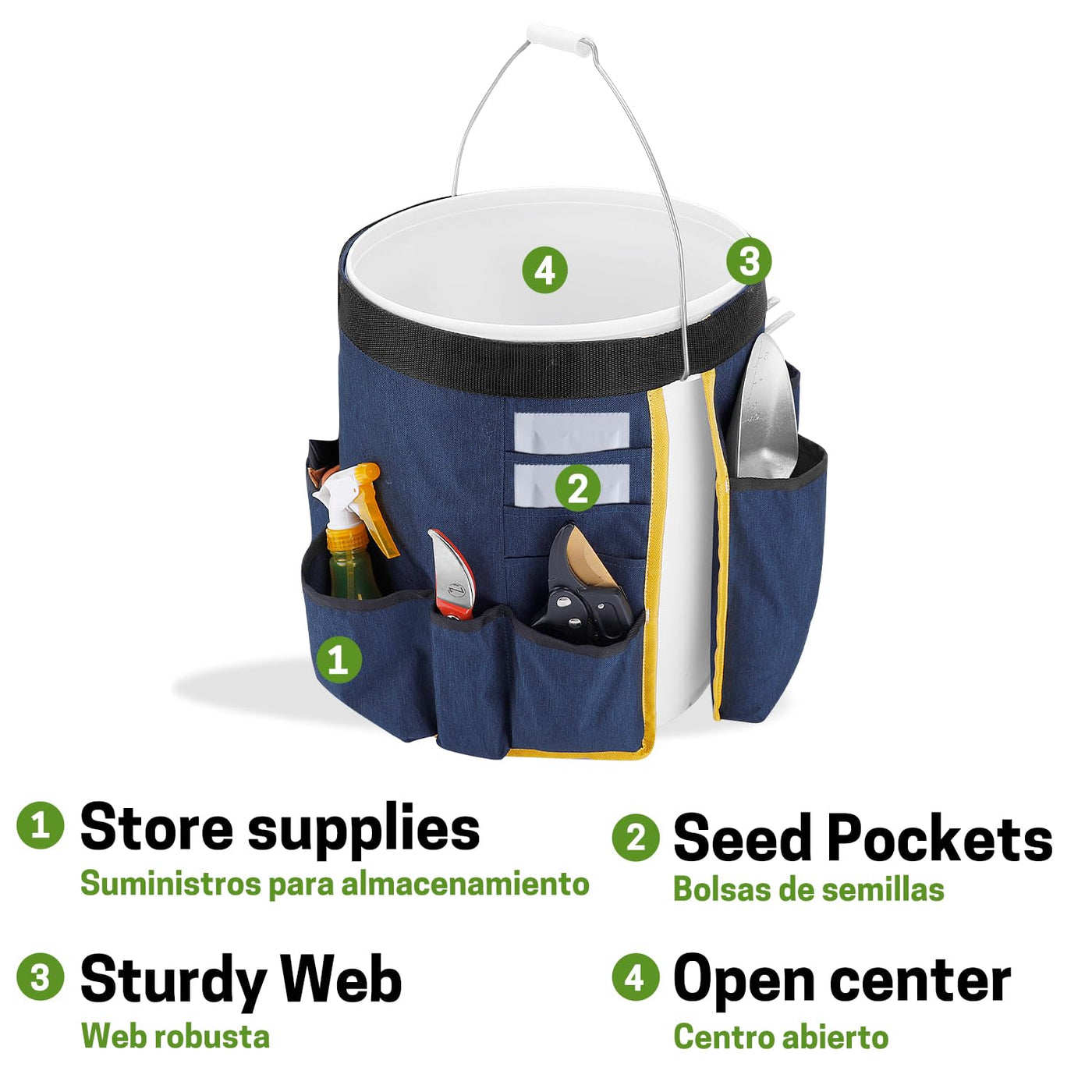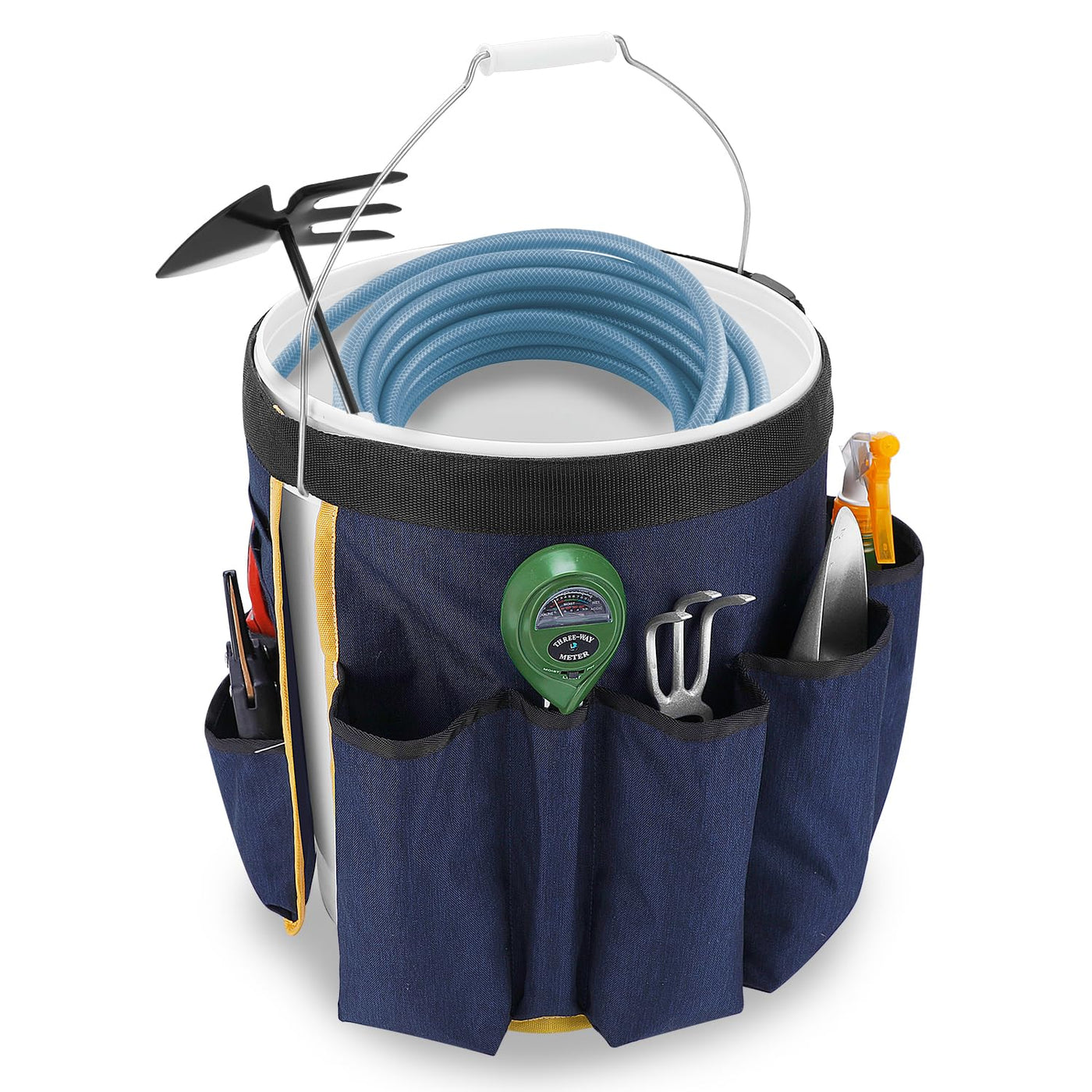 - Multiple Storage Pockets: The bucket tool organizer come with 12 pockets to store gardening supplies. Three small vertical pockets for seed, outer pockets for trowels, spades, soil amendments, spray bottles, pruning shears, water bottle, measuring spoons, etc.