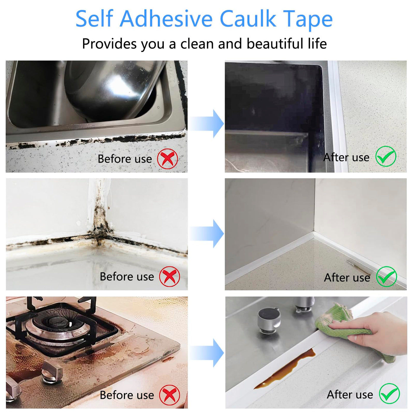 - Self-adhesive & Thick Caulk Tape: the self-adhesive sealing strip tape thicker than most, has stronger adhesion and traction than other caulking tapes, non-degumming, waterproof, this caulking sealant tape covers cracks, crevices and damaged corners perfectly.