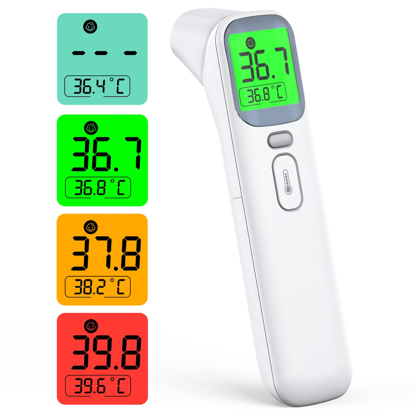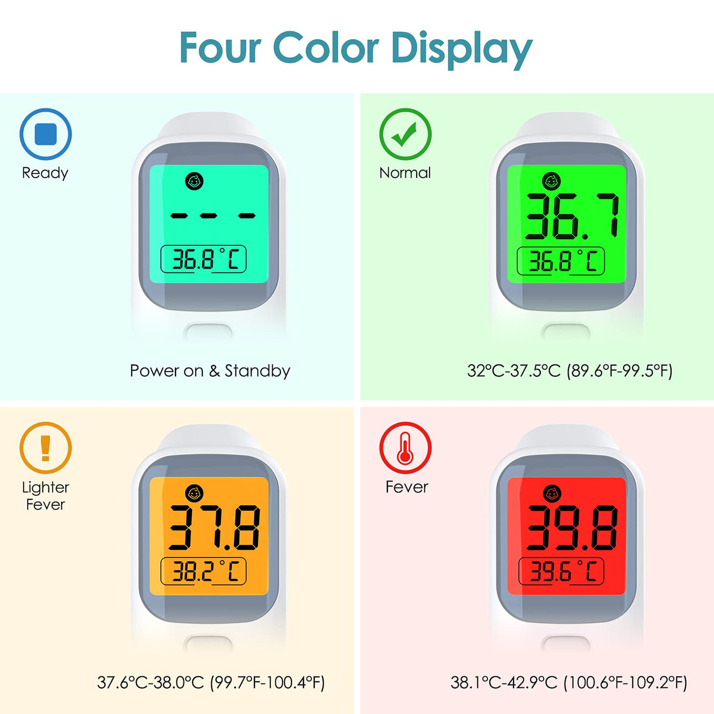 - Fever warning and 4 color backlight This infrared thermometer is equipped with a fever warning system. If 37.6 C T 38.0 C, the orange light is displayed, warning you that you may have a low fever. If 38.1 C T 42.9 C, the red light will appear and warn you that you may have a high fever. The indicator light is white after switching on, and green when 32 C T 37.5 C.