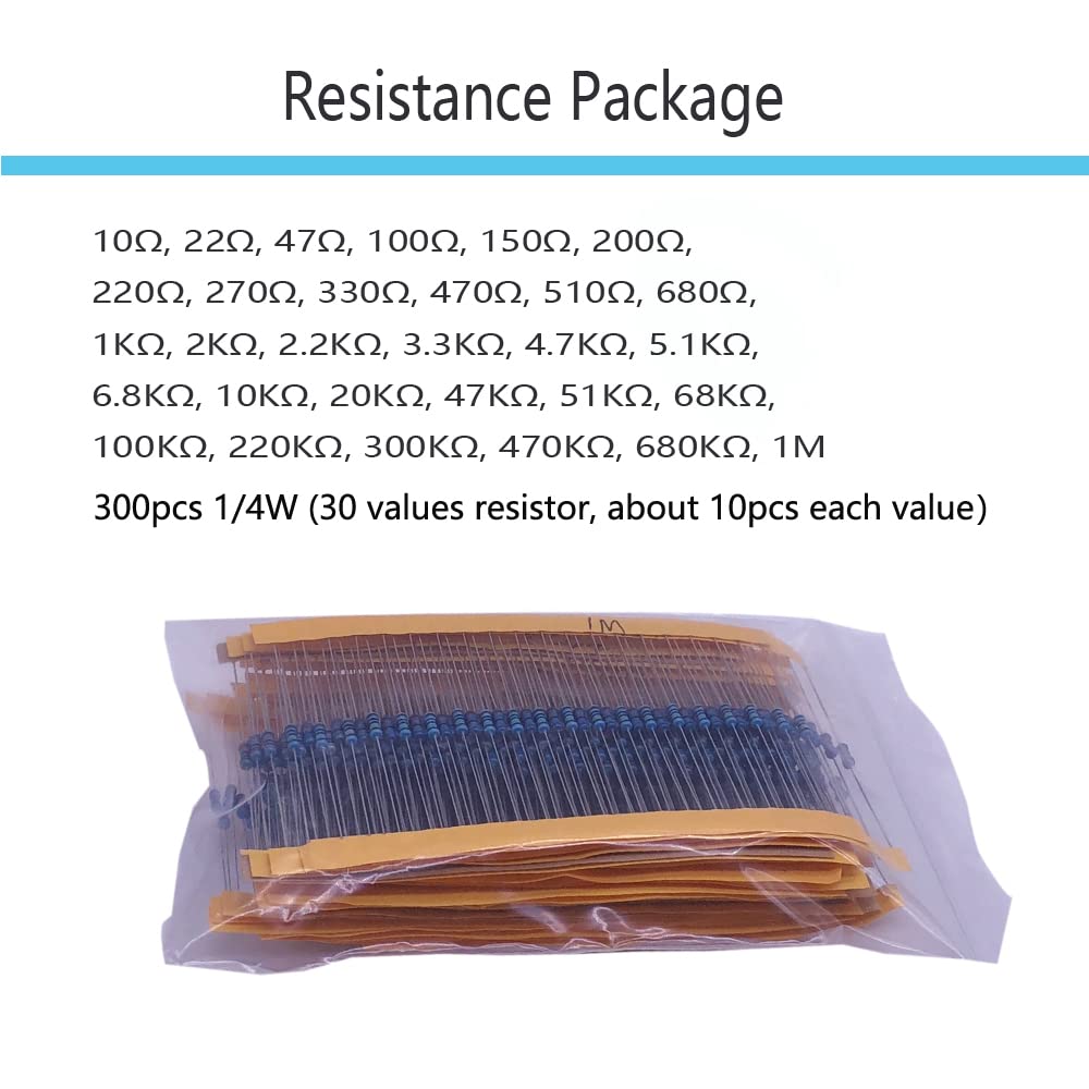 Mogaopi 300pcs 1/4w 1% Metal Film Resistor (30 values resistor, about 10pcs each value)Resistor Values:10Ω, 22Ω, 47Ω, 100Ω, 150Ω, 200Ω,220Ω, 270Ω, 330Ω, 470Ω, 510Ω, 680Ω,1KΩ, 2KΩ, 2.2KΩ, 3.3KΩ, 4.7KΩ, 5.1KΩ,6.8KΩ, 10KΩ, 20KΩ, 47KΩ, 51KΩ, 68KΩ,100KΩ, 220KΩ, 300KΩ, 470KΩ, 680KΩ, 1MComponent List:1 Pcs Power Supply Module1 Pcs 830 tie-points Breadboard140 Pcs Solderless Jumper Wire20 Pcs M/F Jumper Wire65 Pcs Jumper Wire1 Pcs M/M USB Cable2 Pcs 40pin Male Header Connector1 Pcs IC(SN74HC595)1 Pcs 3386P-1-103 10K Potentiometer1 Pcs Tilt Switch1 Pcs Passive Buzzer1 Pcs Active Buzzer2 Pcs 5516 Photoresistor2 Pcs Thermistor10 Pcs Electrolytic Capacitor (10UF 50V)10 Pcs Electrolytic Capacitor (100UF 50V)10 Pcs Push Buttons10 Pcs Colorful Push Button Caps10 Pcs NPN Transistor (2N2222)10 Pcs Rectifier Diode(1N4007)10 Pcs Ceramic Capacitor(100nF)10 Pcs Ceramic Capacitor(22pF)10 Pcs White LED(5mm)10 Pcs Red LED(5mm)10 Pcss Yellow LED(5mm)10 Pcs Green LED(5mm)10 Pcs Blue LED(5mm)2 Pcs RGB LED(5mm)1 Pcs 1-Digit 7 Segment LED Display(Common cathode) 1 Pcs 4-Digit 7 Segment LED Display(Common cathode)1 Pcs PIR Motion Sensor1 Pcs Stainless Steel Tweezers1 Pcs Acrylic test bench1 Pcs 1 Channel Relay Module