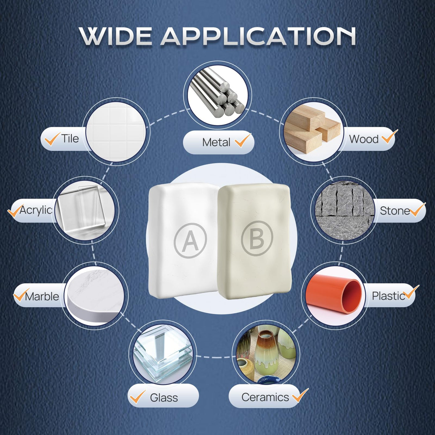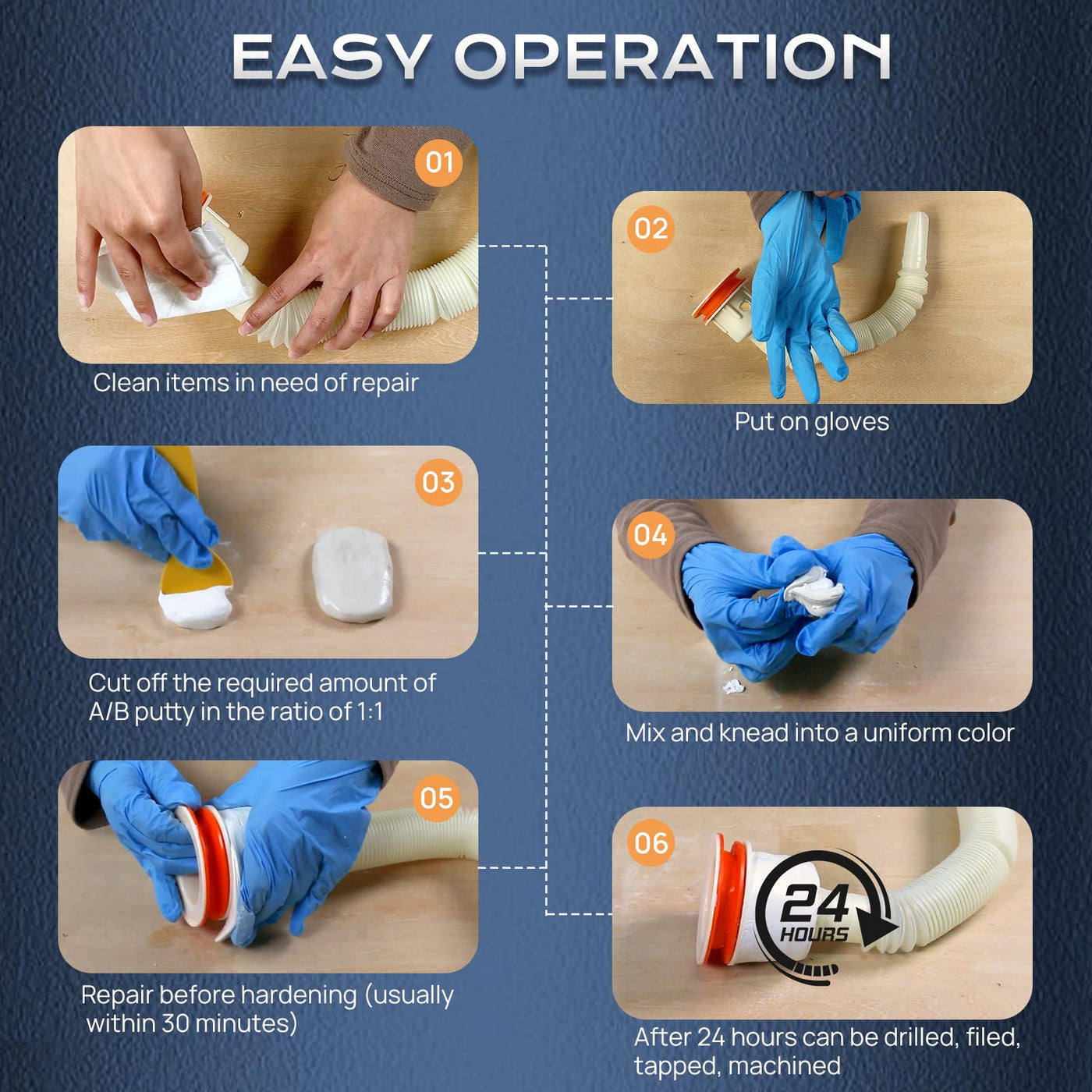 - Simple Operation: Simply use a spatula to cut the AB pool putty in a 1:1 ratio and knead it well until the epoxy putty stick turns off-white. Stick the epoxy wood filler on the item to be repaired before it hardens (within 30 minutes) and the epoxy putty will be fully cured after 24 hours. Note: Please avoid using epoxy putty underwater.