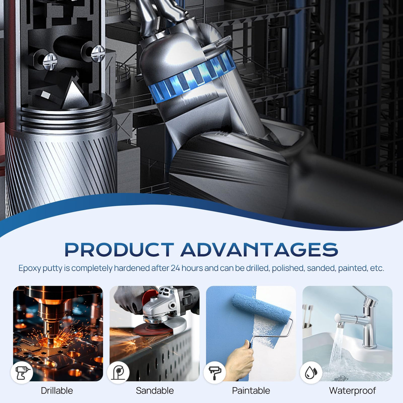 - Excellent Performance Epoxy Metal Glue: Adhesive epoxy putty for bonding, filling, sculpting, and repairing has excellent ressistance to corrosion, acids, oils, water, and impact. Withstands temperatures from -58F to 266F. Wood filler putty contains no irritants or odors and is harmless to humans. This epoxy filler putty is suitable for most scenarios of repair such as pipes, sculptures, wood furniture, bathtubs, pools, concrete, faucets, and more!