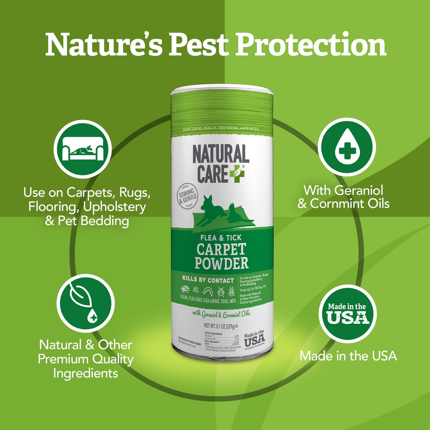 - GENTLE PROTECTION: Natural Care+'s Flea & Tick Carpet Powder uses certified natural ingredients to kill fleas, flea eggs, and ticks by contact.