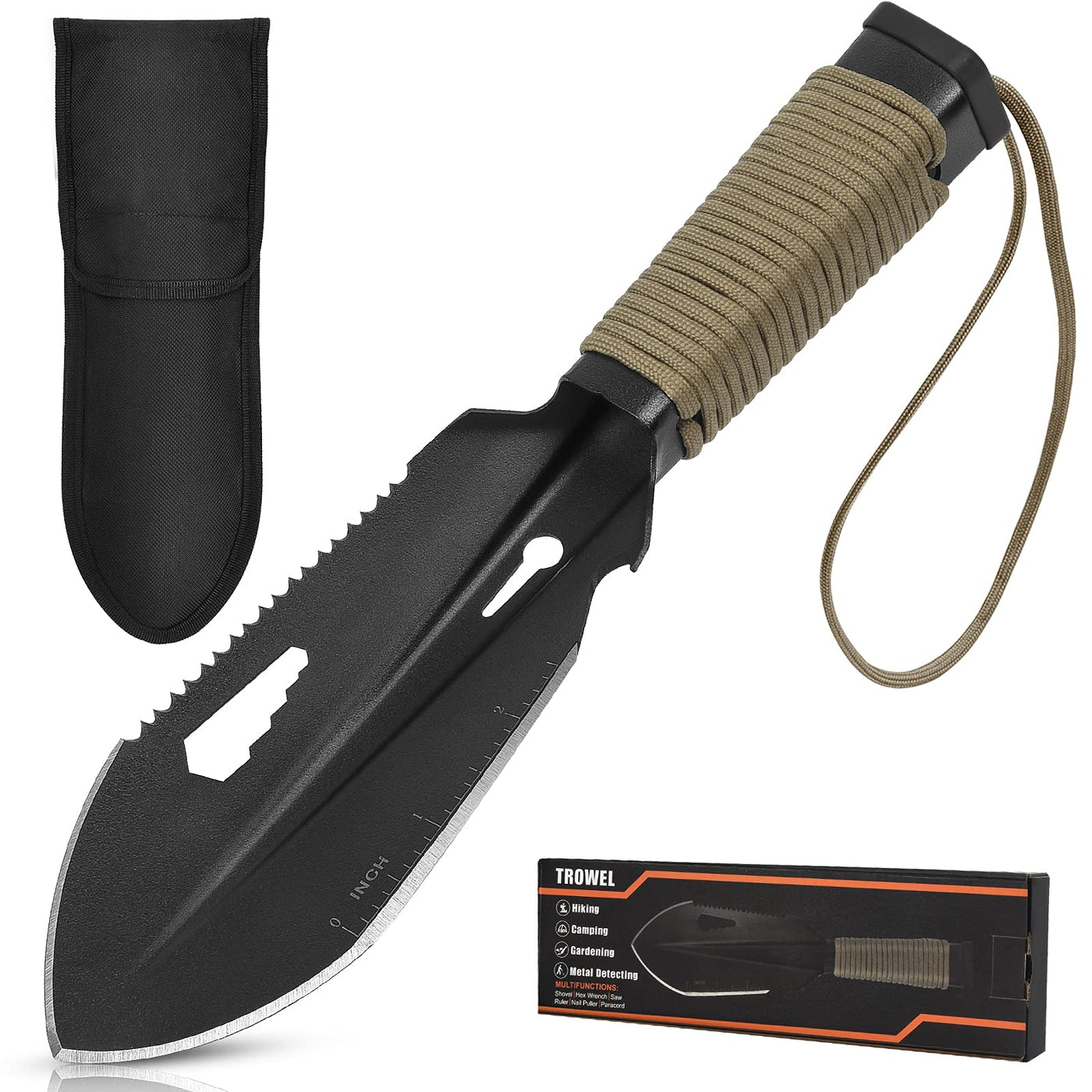 - Multifunctional Hiking Trowel: Shovel, Saw, Ruler, Nail Extractor, Hex Wrench, Rope Cutter, Survival Paracord. This portable camping trowel fits in a convenient carrying sheath with a belt loop, it's easy for you to hang it on your belt. You can be sure to be prepared for anything!
