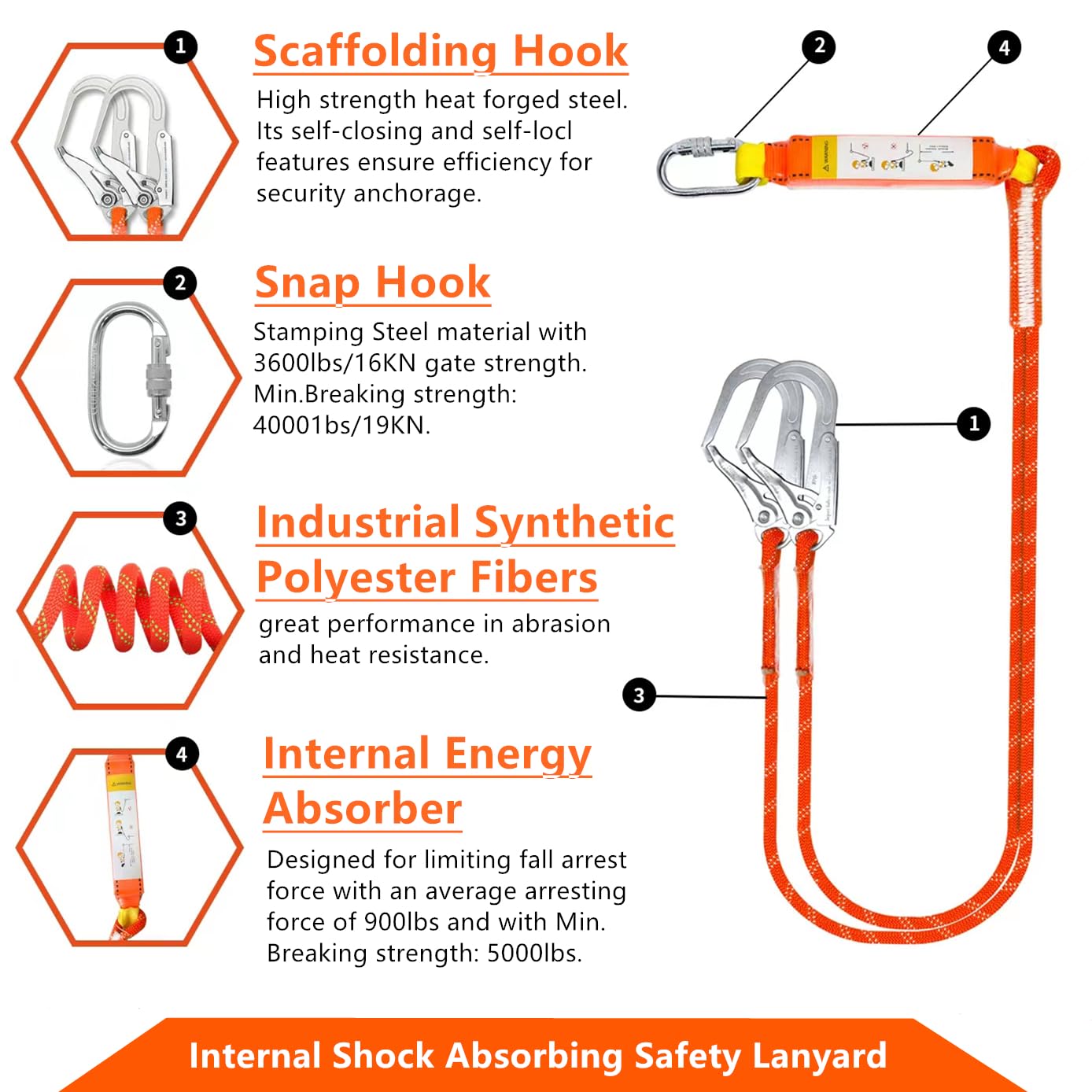 Full Body Safety Harness Tool Fall Protection,OSHA/ANSI Compliant,ASTM F1774certified | INTERNAL Shock Absorbing Lanyard(Orange)