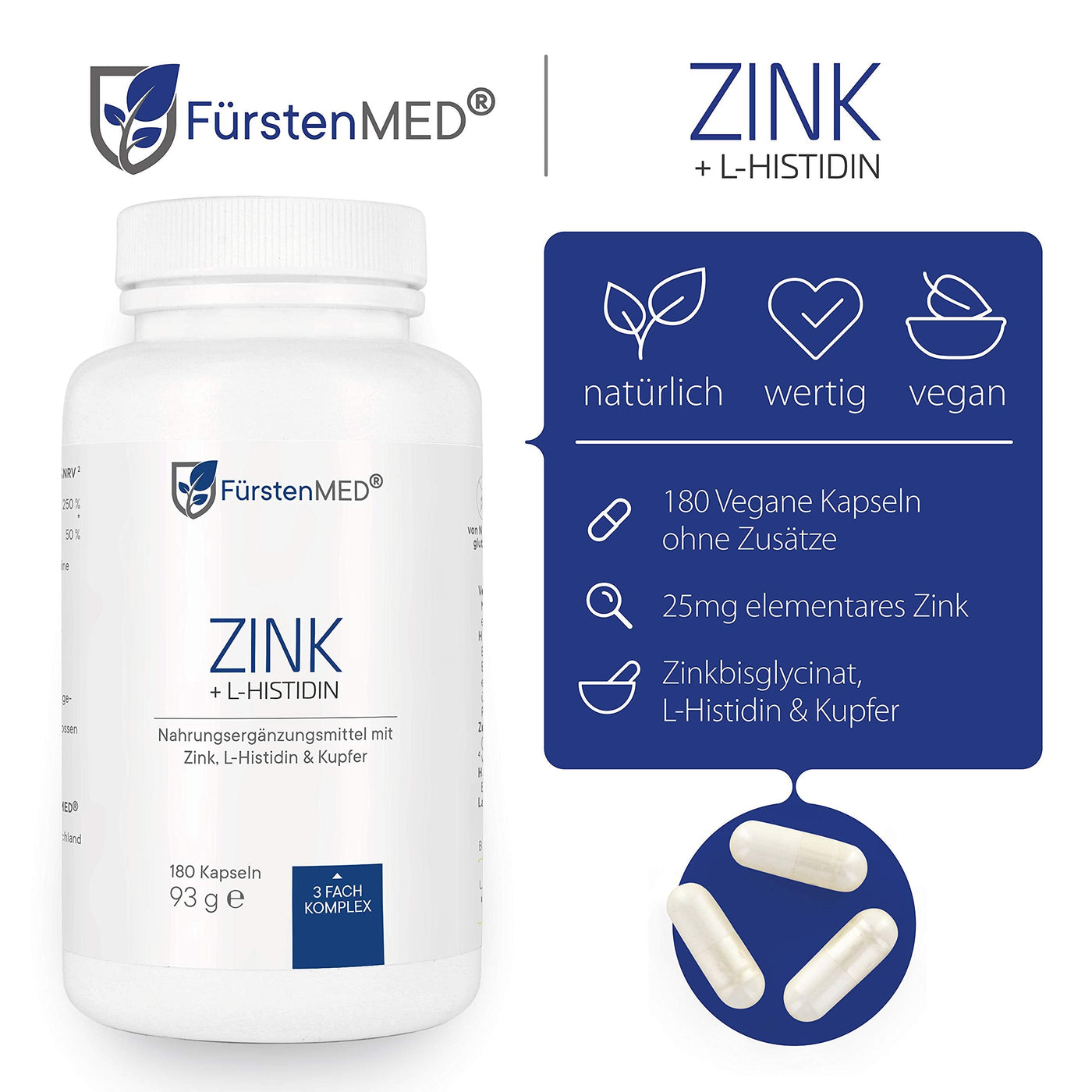 FürstenMED® Zinc Capsules High Dose - Zinc High Dose Zinc 25mg - Zinc Bisglycinate + L-Histidine + Copper - Zinc High Dose - 180 Vegan (Zinc Supplement) Capsules without Additives