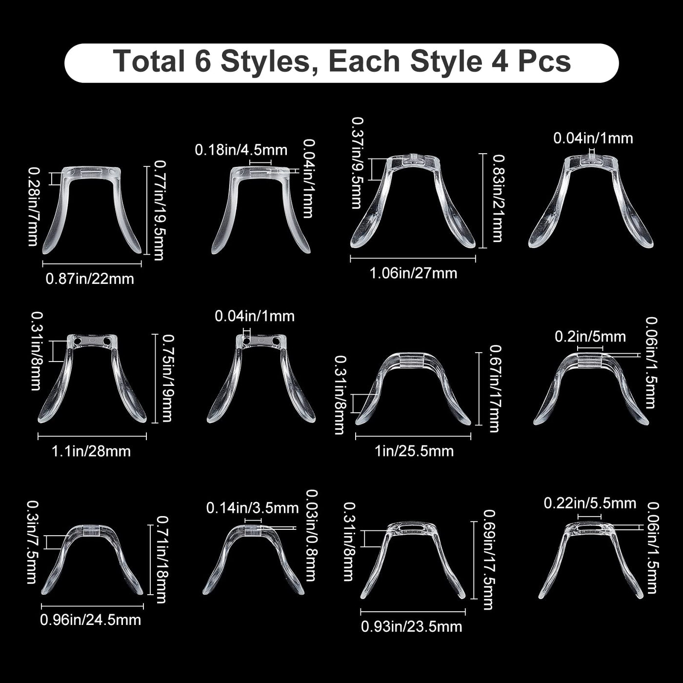 - 624 Style 24 PIECES]: The package includes 6 U-shaped glasses nose pads in [different styles, each style 4pcs, size about 22x20mm, bridge is 4.5mm wide; 27x21 mm, bridge: 1mm; 28x19 mm, bridge: 1mm; 26x17 mm, bridge: 5mm; 25x18 mm, bridge: 3.5mm; 23.5x17.5mm, Bridge: 5.5mm.