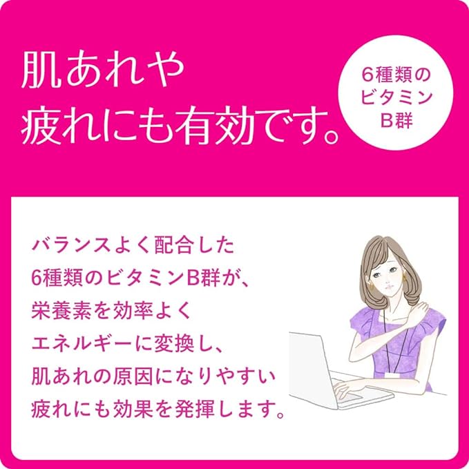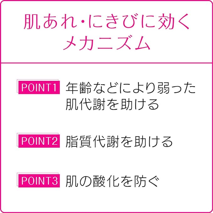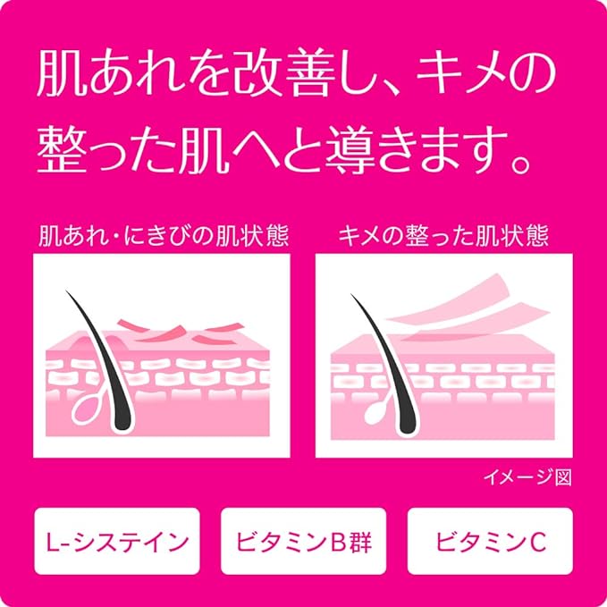 The formula contains the amino acid "L-cysteine," which helps skin metabolism, vitamin B group, and vitamin C. It helps lipid metabolism and collagen production, and normalizes the regeneration of skin cells. It improves rough skin and acne, leading to smooth and clear skin.