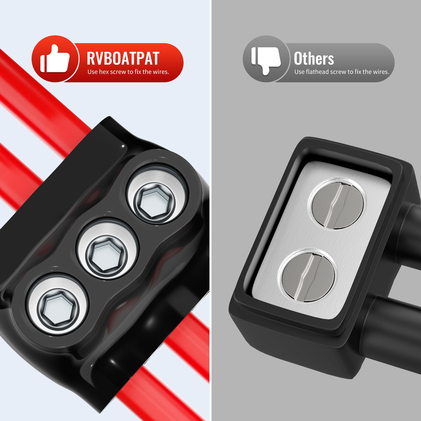 - Product Features: Our insulated connectors are easy to disconnect and reconnect cables, which is safer and more convenient than a butterfly nut connector, with a larger wire diameter range and higher current. It uses hexagonal screws to secure the wires and is equipped with a lubricant in the port that has oxidation resistance