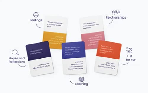 - MEANINGFUL & FUN: Each card is color-coded corresponding to five categories: Learning, Relationships, Feelings, Just for Fun, and Hopes & Reflections to help guide your conversation.