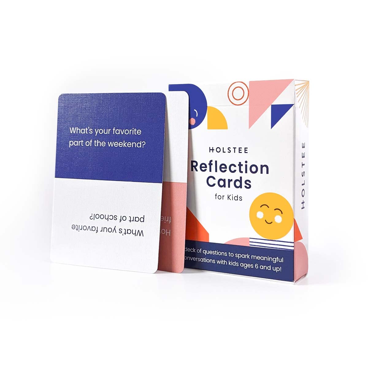 Holstee Reflection Cards for Kids are a fun way to engage young minds by sharing stories, expressing feelings, and revealing hopes and dreams. Every deck includes 100+ thought-provoking questions organized into five categories: Learning, Relationships, Feelings, Just for Fun, and Hopes & Reflections. Perfect for kids to use with their friends, family, or in the classroom! A great way to get kids to open up! Holstee Reflection Cards for Kids are designed to help children age 6 and up and their caregivers go far beyond “How was school today?” and the one-word responses that usually follow. Similar to the original Holstee Reflection Cards, each card offers two questions: an icebreaker with a fun and funny prompt to warm things up and on the opposite side a deeper question that requires just the right amount of vulnerability and introspection. Read more The story behind the Reflection Cards for Kids. This product’s journey began the moment our original Reflection Cards landed in the hands of a curious 9-year-old named Shireen (Mike and Dave’s niece). Shireen loved using the cards to ask questions and share her responses with friends and family. She also had some great feedback for us, while she loved the questions, but not all of them were perfect for kids. Read more “You should make a deck of Reflection Cards, but just for kids! I can help!” — Shireen (our niece), age 9 We began asking every kid we knew about the best questions to ask other kids. We also asked their parents, aunts, uncles, grandparents, teachers, and older siblings, too. ;-) Then came the hard work of narrowing down our excellent list of questions to make sure only the best questions remained. To be certain that every question speaks the language of today’s kids, we enlisted two breakout leaders in the mindful parenting movement: Hannah and Kelty of Upbringing.co. With their guidance, we tweaked the questions until each one was pitch-perfect for young and curious minds. “Engaging this way with our kids can be an incredible way to slow down and build awareness, connection and trust around critical topics that otherwise may be overlooked in our busy day to day lives. Each card can remind us that our kids are the ultimate experts of themselves, and is a reminder to us that we can be a safe place to listen and learn from them... even after the cards have been put away." — Hannah and Kelty, Upbringing.co The result is a deck of 100+ questions that spark joy and meaning for kids and adults! Theme- based Every deck includes 100+ thought-provoking questions organized into five categories: Learning, Relationships, Feelings, Just for Fun, and Hopes & Reflections. Topics that are fun to reflect on and encourage positive conversations. Art & Conversation Each card has a unique and abstract design, representing the adventures, stories, and ideas that make us who we are. When brought together, the cards make a single, connected piece of art — a reminder that we are united in our differences Quality & Sustainability Our cards are made in the USA from high-quality sustainably-forested paper using vegetable- based printing inks. The starch-based laminating we use make these cards as durable as they are beautiful. At the end of their long life, the cards are also recyclable. Read more “For a society that feels increasingly polarized, we need to find new ways to find common ground and understanding. At Holstee, we feel there is no better way to foster a sense of connection than by sharing the stories that shape who we are.”