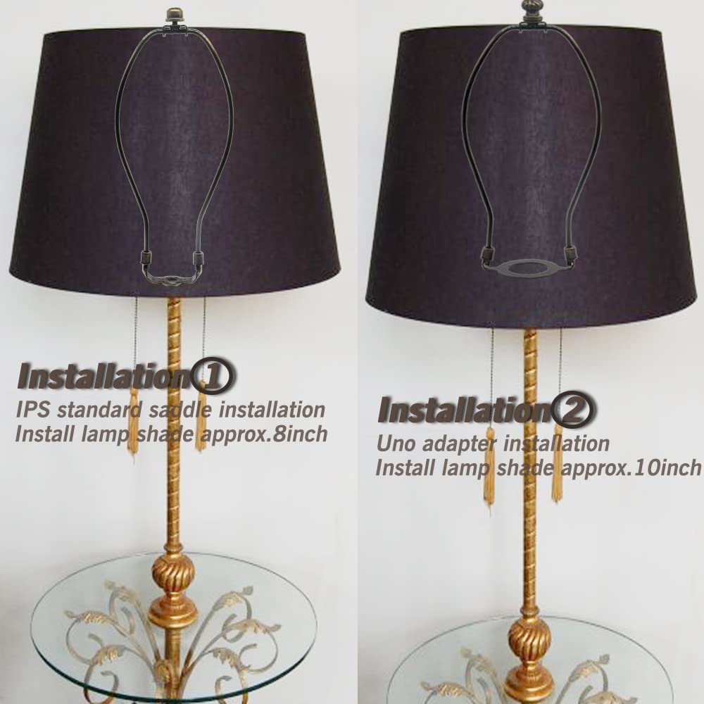 The lamp harp is a convenient and simple lampshade attachment.No tools needed to finish your sturdy installtion work.Fix it onto the lamp pipe or E26 light bulb,a spider lampshade goes on top. Reminder: Only suitable for Spider lamp shade PACKAGE CONTENTS: -1 X 8 Inch Bronze Lamp Harp -1 X Saddle Base Adapter(fitted) -1 X Uno fitter adapter -1 X Finial in antique brass finish(screwed-in) and 1 X Spare Heavy Bronze Finial