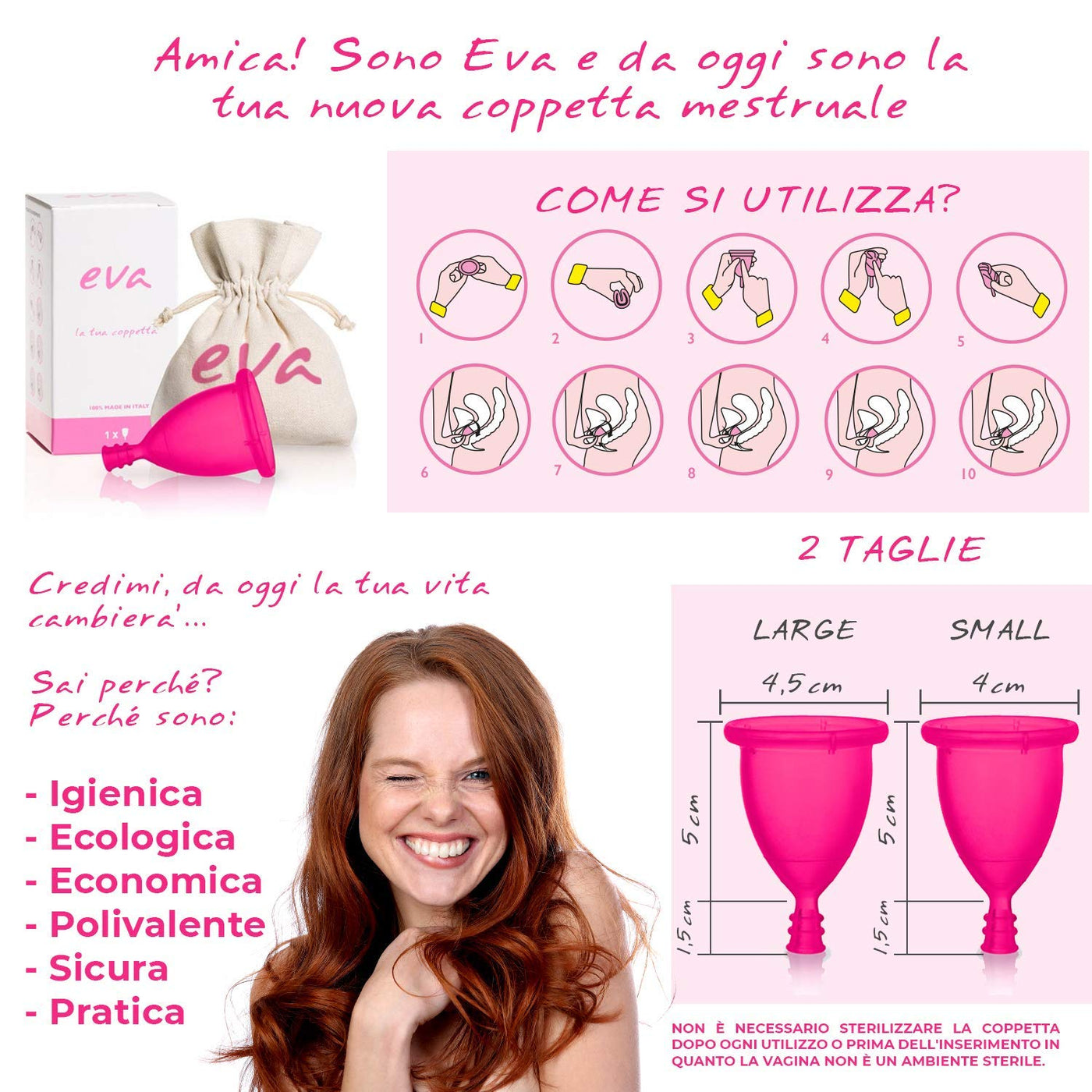 - Eva cup is easy to use, comfortable, capacious (ideal even if you have a heavy flow) and allows you to avoid the discomfort and irritations typical of tampons and pads. You will forget about your period!
