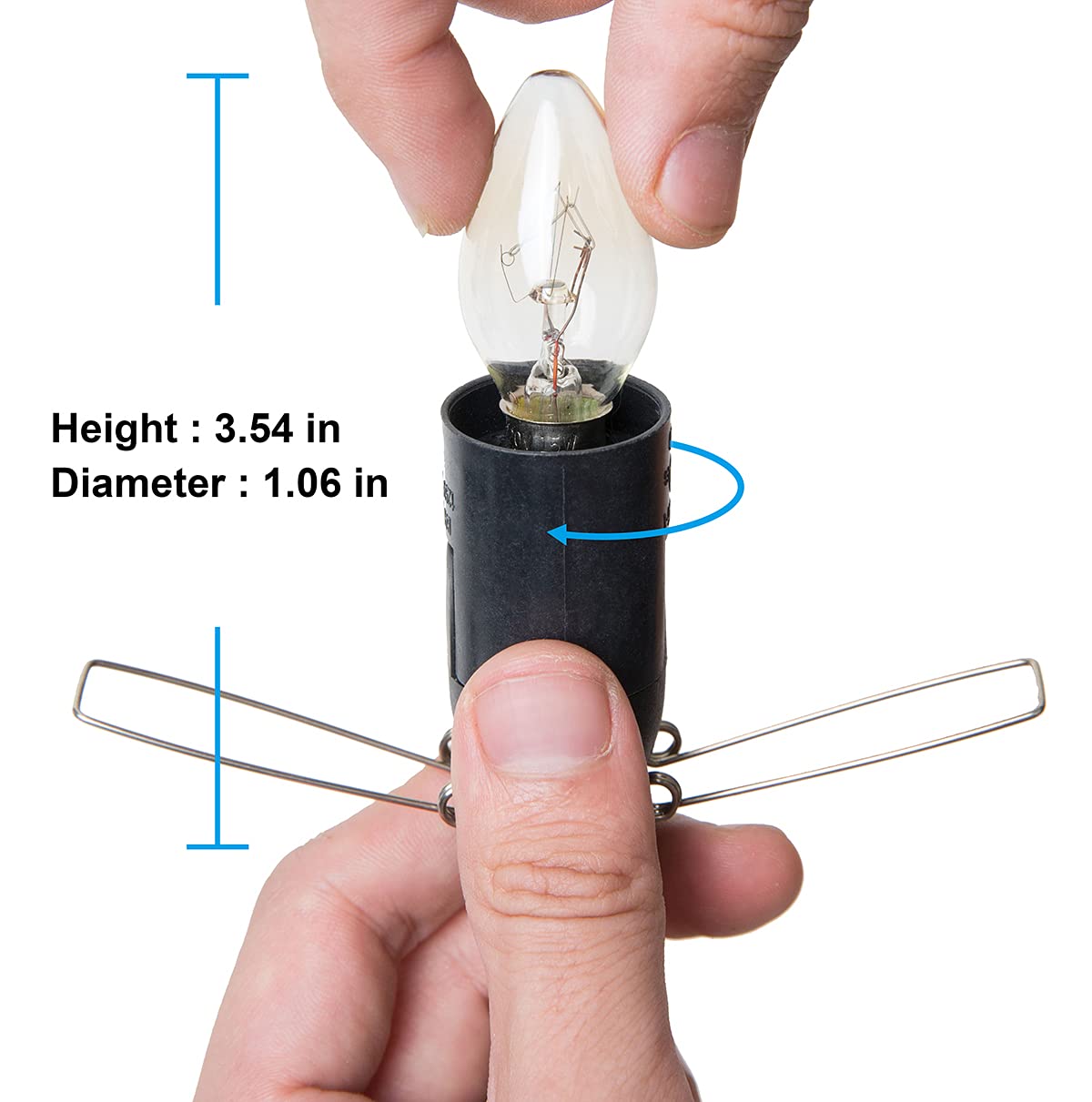 Himalayan Salt Lamp Original Replacement Cord (5 feet) with Dimmer Switch & Metal Clip for Salt Rock Lamp OHLGT SALT LAMP CORD Features: OHLGT salt lamp cord with metal clip fits up a range of the bottom hole's diameter over 1.18 inch and height over 3.54 inch (height 3.937 inch with our light bulb).Our lamp cord with a dimmer knob can change the brightness of the halogen bulbs, which help you to adjust ambience of your bedroom with a simple turn of the knob.It allows you to run your salt lamp low enough that it doesn't be so bright to interrupt sleep, it's a customized light switch.Some customer turns on salt lamp the whole day, in general we do not recommend doing this, continuous use will shorten life of the item. Why Choose OHLGT? Suitable for majority salt lamp Our salt lamp cords with metal clip can fit up majority salt lamps on the market.Two cords a set helping people who have multiple salt lamps in your home. Multiple choice OHLGT provides 4 kinds of salt lamp cord choices to our user, please Measure your Dimension of your salt lamp bottom hole before ordering.Butterfly Clip fit up much Smaller hole than Base Assembly, so if you have a Small salt lamp, we suggest you choose Butterfly Clip. Used for longer time Come with 8 pcs 15 watt E12 replacement salt lamp light bulbs.Some customers say that bulbs broken after long time use, so we send you 8 bulbs to ensure your salt lamps continue to use. Read more Original Salt Lamp Replacement Cord PACKAGE INCLUDES 2 Packs OHLGT Salt Lamp Cords with Dimmable Switch & Metal Clip8 Packs Free 15W Halogen Bulbs SPECIFICATION Dimmable: Yes Plug: Polarized Socket: E12 Standard Wire Type: SPT-2 Input Voltage: 100V~120V Material of Cord: PVC, PET, ABS, PC Core Material: 0.824mm² US standard Copper Core Read more Salt lamp light bulb Replacement Salt lamp cord with Base Salt lamp cord with Clip(little base) Salt lamp cord with Base New Series Salt lamp cord with Clip Salt lamp cord with Base Available for the Smallest Hole Diameter E12 Socket 1.38inch / 35mm 1.12inch / 28mm 1.26inch / 32mm 1.12inch / 28mm 1.38inch / 35mm Available for the Smallest Hole Height E12 Socket 3.54inch / 90mm 3.54inch / 90mm 3.54inch / 90mm 3.54inch / 90mm 3.54inch / 90mm Available for the Smallest Hole Height with light bulb E12 Socket 3.937inch/100mm 3.937inch/100mm 3.937inch/100mm 3.937inch/100mm 3.937inch/100mm Number of Bulbs 6 Pack 6 Pack 6 Pack 6 Pack 6 Pack 6 Pack Number of Cords / 2 Pack 2 Pack 2 Pack 1 Pack 1 Pack Cord Type e12 Base Assembly Butterfly Clip&Little base Base Assembly for smaller hole Butterfly Metal Clip Base Assembly
