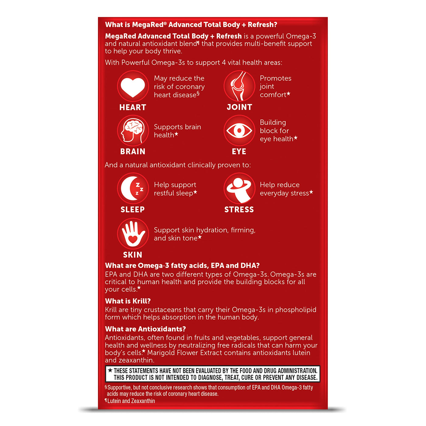 MegaRed Advanced Total Body + Refresh is a powerful Omega-3 and natural antioxidant blend¶ that provides multi-benefit support. Powerful Omega-3s support 4 vital health areas: Heart (may reduce the risk of coronary heart disease§), Joints (promote joint comfort), Brain (supports brain health) and Eyes (building block for eye health). It also contains a natural antioxidant that is clinically proven to: help support restful sleep, reduce everyday stress and support skin hydration, firming & skin tone. WHAT ARE OMEGA-3 FATTY ACIDS: EPA and DHA are two different types of Omega-3s. Omega-3s are critical to human health and provide the building blocks for all your cells. WHAT IS KRILL: Krill are tiny crustaceans that carry their Omega-3s in phospholipid form which helps absorption in the human body. WHAT ARE ANTIOXIDANTS: Antioxidants (like the Lutein and Zeaxanthin) support general health & wellness by neutralizing free radicals that can harm your body's cells. These statements have not been evaluated by the food and drug administration. This product is not intended to diagnose, treat, cure or prevent any disease. ¶Lutein and Zeaxanthin. §Supportive, but not conclusive research shows that consumption of EPA and DHA Omega-3 fatty acids may reduce the risk of coronary heart disease.