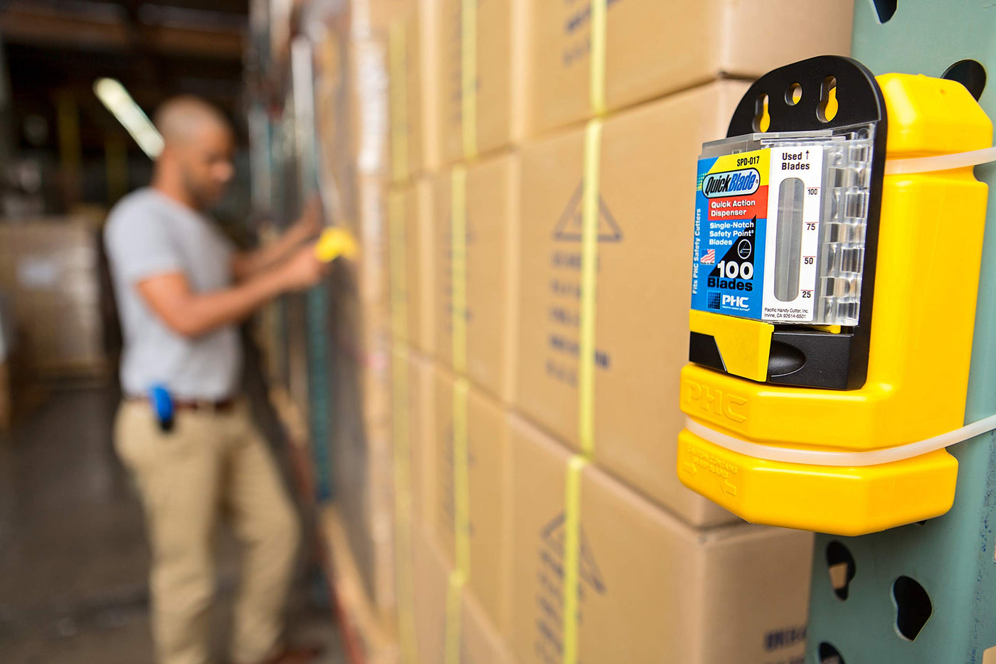 The Pacific Handy Cutter Blade Bank can be easily placed or mounted anywhere in your store, warehouse, or workplace. This compact blade disposal container safely stores over 750 used blades. Proudly made in the USA, this product includes two zip ties and a metal wall mount that attaches easily and securely to any wall, post, pallet rack, forklift, and more. Plus, by pairing one of PHC's Blade Dispensers (SPD017, QBD324, RBD009 or QBD379) to the front of the Blade Bank, you create a convenient Blade Change Station that will increase the safety and efficiency of your staff. By using both items together, your employees will be encouraged to properly dispose of loose blades and easily access new replacement blades near their work stations and throughout your facility, ultimately increasing overall productivity and reducing the risk of injury or loose blades.