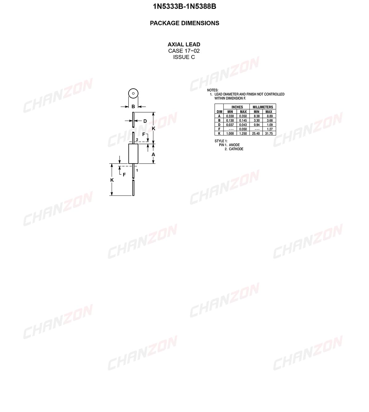 Please refer to image 2-7 for the specification datasheet. Product Type: ZENER DIODE Brand: Chanzon Part Number: 1N5349B Package Case: T-18 QTY: 20 Note:Pack in a ESD Bag with Main Specs Label, for Long Time Protection and Indetification.