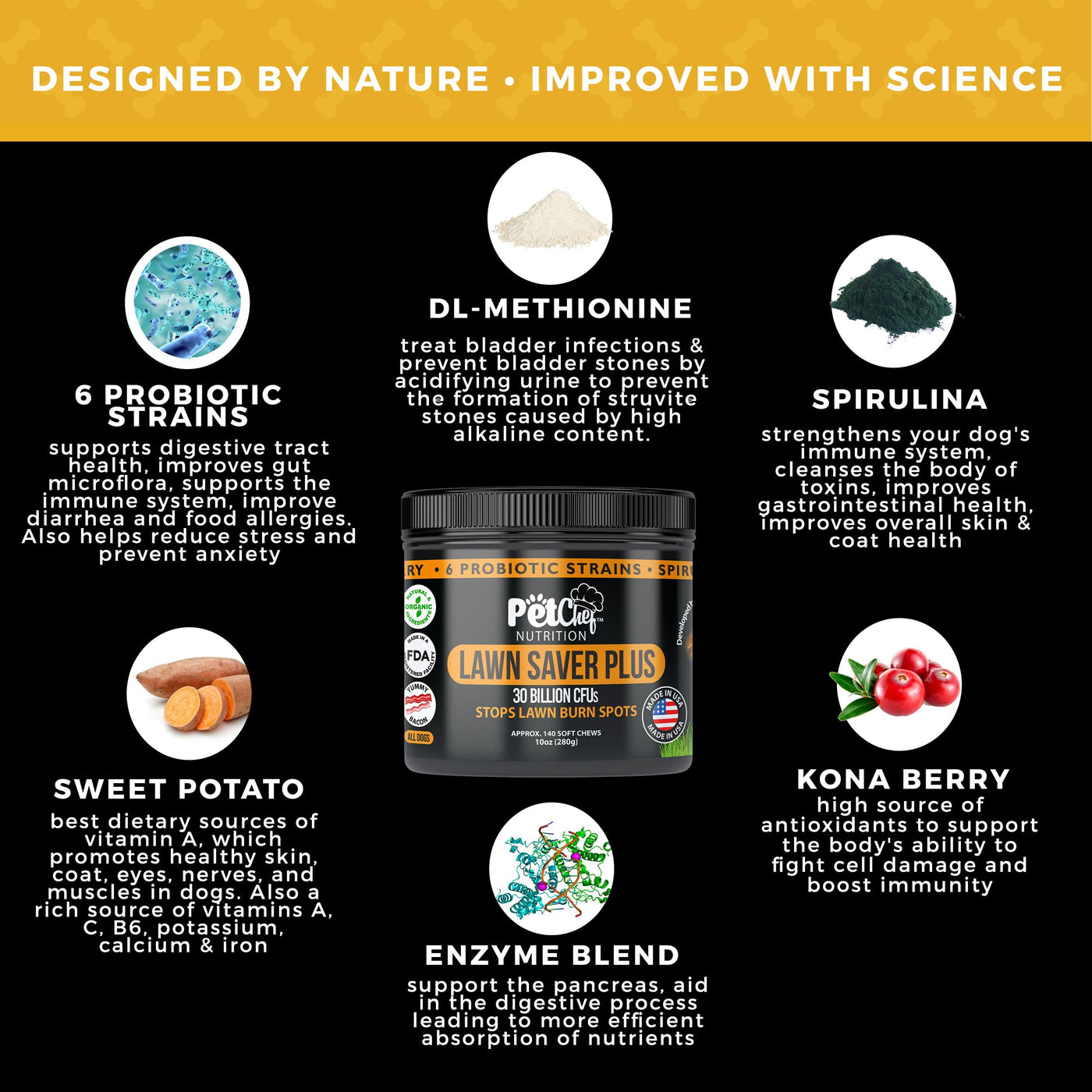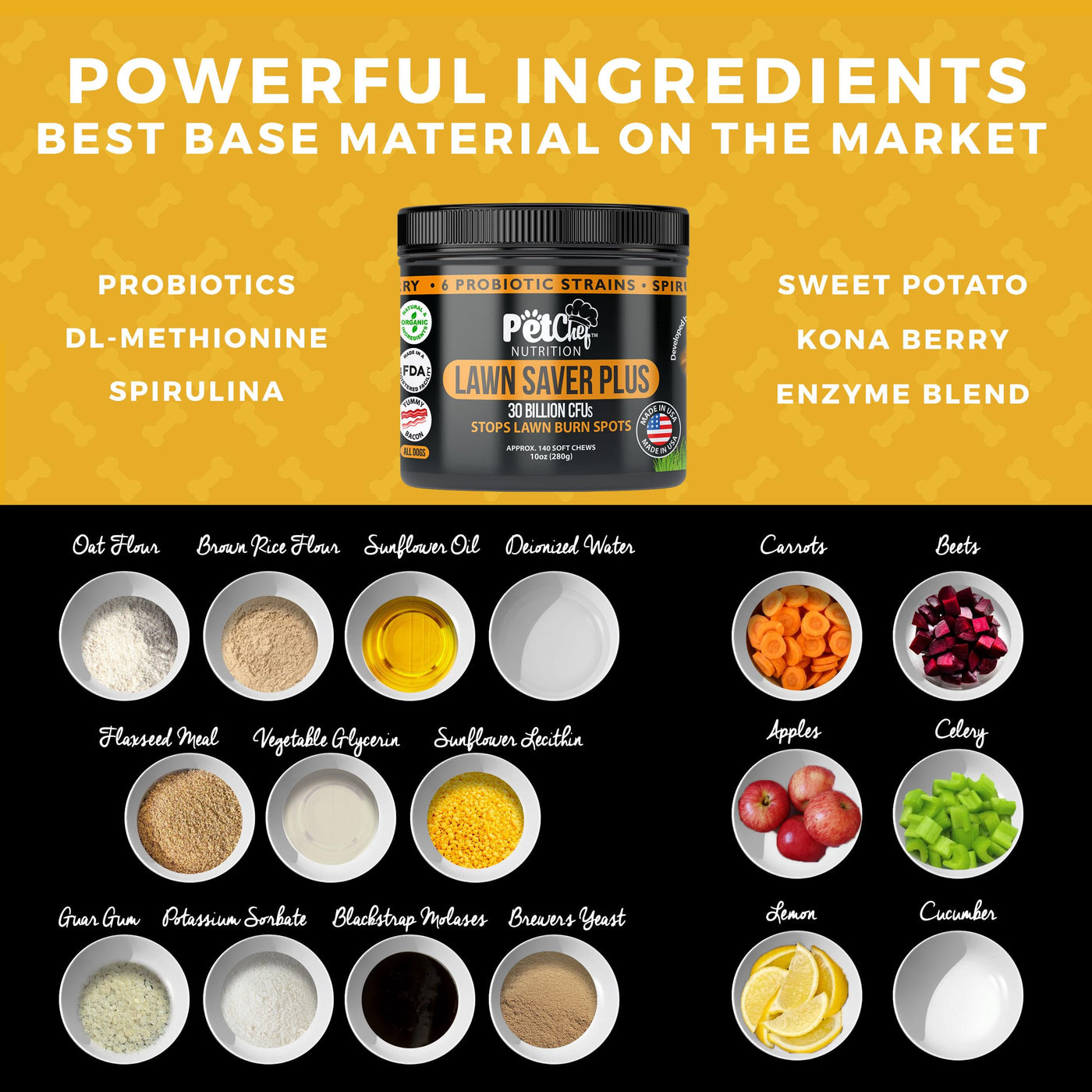 - Safe and Natural - Pet Chef Lawn Saver PLUS! is a natural solution to protect your lawn from dog urine spots. It's safe for your pets and for your lawn, making it a reliable choice for pet owners. No chemical dog treats that are natural and organic.