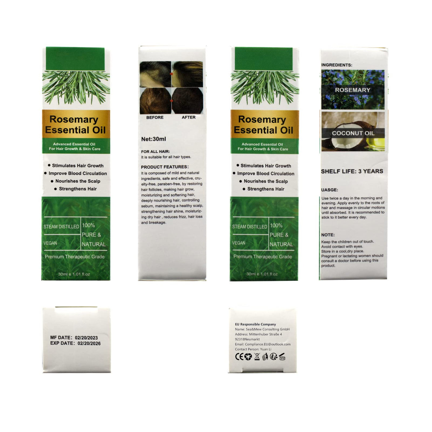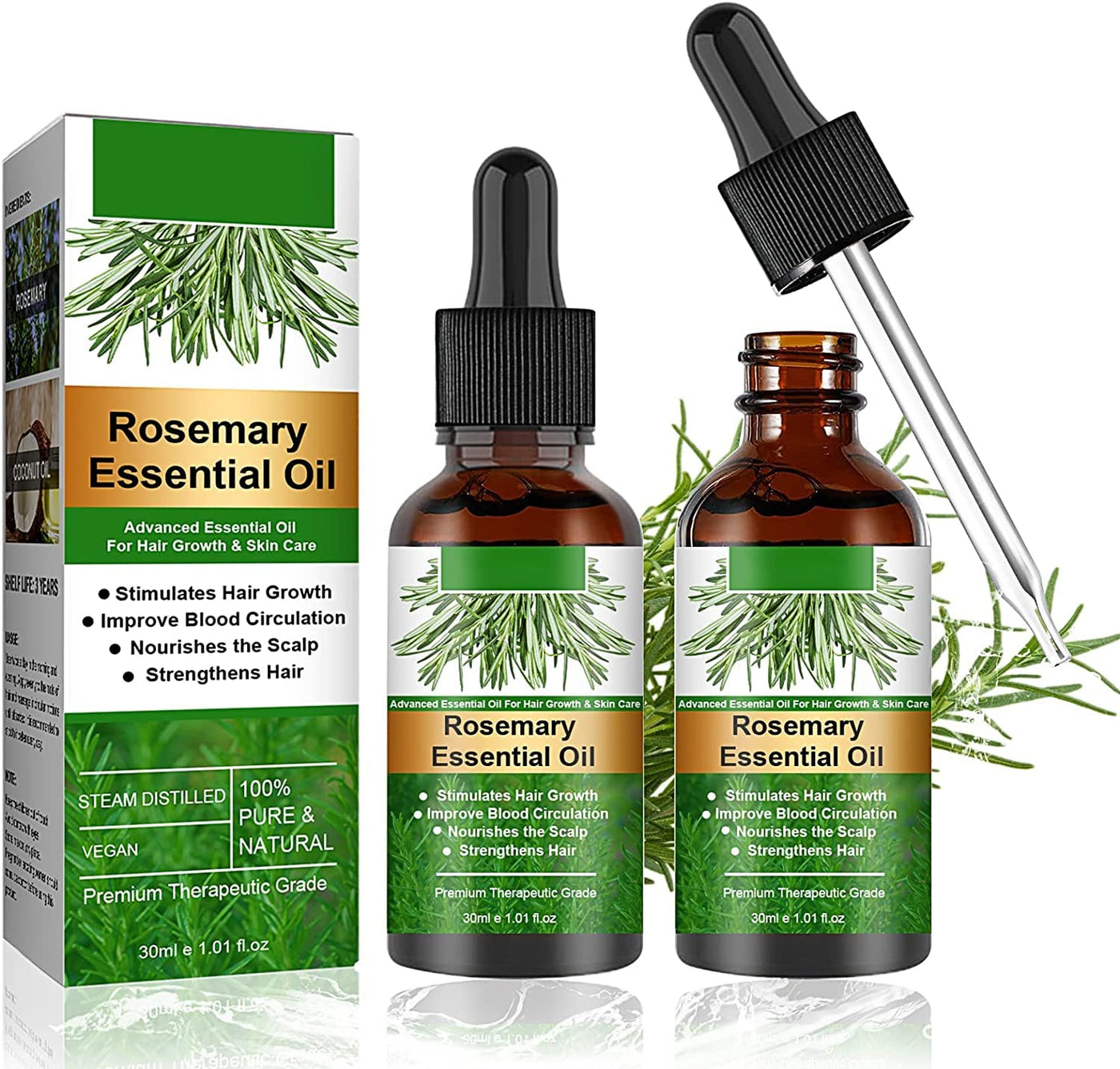 Rosemary Hair Oil Rosemary essential oil is a mainstay of aromatherapy, not only because of its pleasant aroma, but also because it stimulates hair growth. We recommend that you also use rosemary oil for hair care in the shower.How to use rosemary oil for hair care?Here are some ways you can use rosemary essential oil as a hair restructuring and thickening agent. In the beginning, you can try it once or twice a week.Massage the scalp directlyAfter bathing or showering, take about 5 drops of rosemary essential oil and massage it evenly on the scalp. Leave the oil on your scalp for at least 5-10 minutes while rinsing.Mix a few drops into shampooYou can mix 2-3 drops into your shampoo, but don't add too much. Or mix 1-2 drops into any hair care product before use.What should I know before using rosemary essential oil?- For external use only. Not for ophthalmic or oral use.- Also be careful not to apply too much to the scalp. Discontinue use if it causes discomfort.- Possible skin sensitivity. Keep out of reach of children. Consult your doctor if you are pregnant, breastfeeding or under medical treatment. Avoid contact with eyes, inner ear and sensitive areas. Avoid getting essential oils in your eyes. In case of contact, rinse eyes immediately with cold water.Specific:1 set of 2 30 mlSize 10.6 2.8 cm