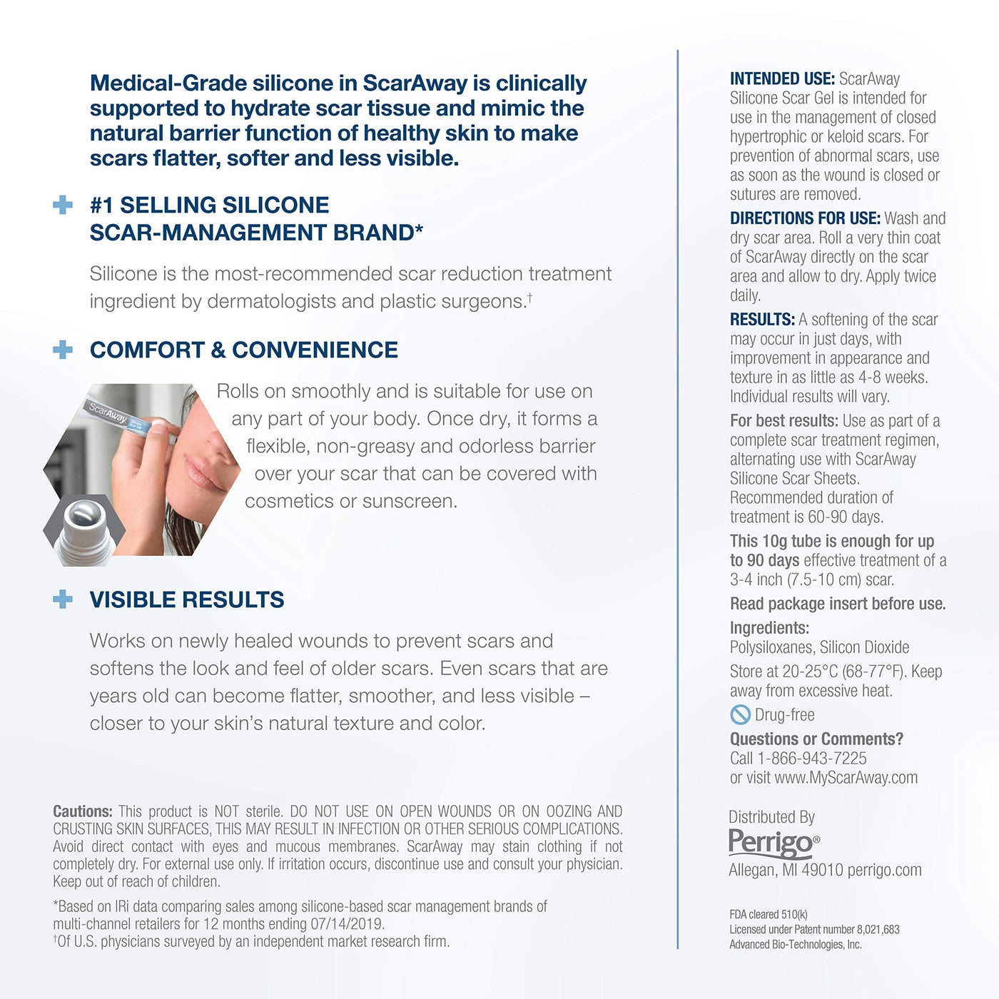 ScarAway hundred percenatge Silicone Scar Gel visibly improves the appearance of both old and new scars. Even scars that are years old and appear raised and discolored can become flatter smoother and less visible closer to your skins natural texture and color. Silicone is the 1 dermatologist and plastic surgeon recommended scar reduction treatment ingredient; ScarAway Silicone Gel works on newly healed wounds and on visible older scars including hypertrophic scars and keloid scars. The convenient roller applicator gently applies silicone gel to help soften smooth and diminish the appearance of scars. Of U.S. physicians surveyed by an independent market research firm.