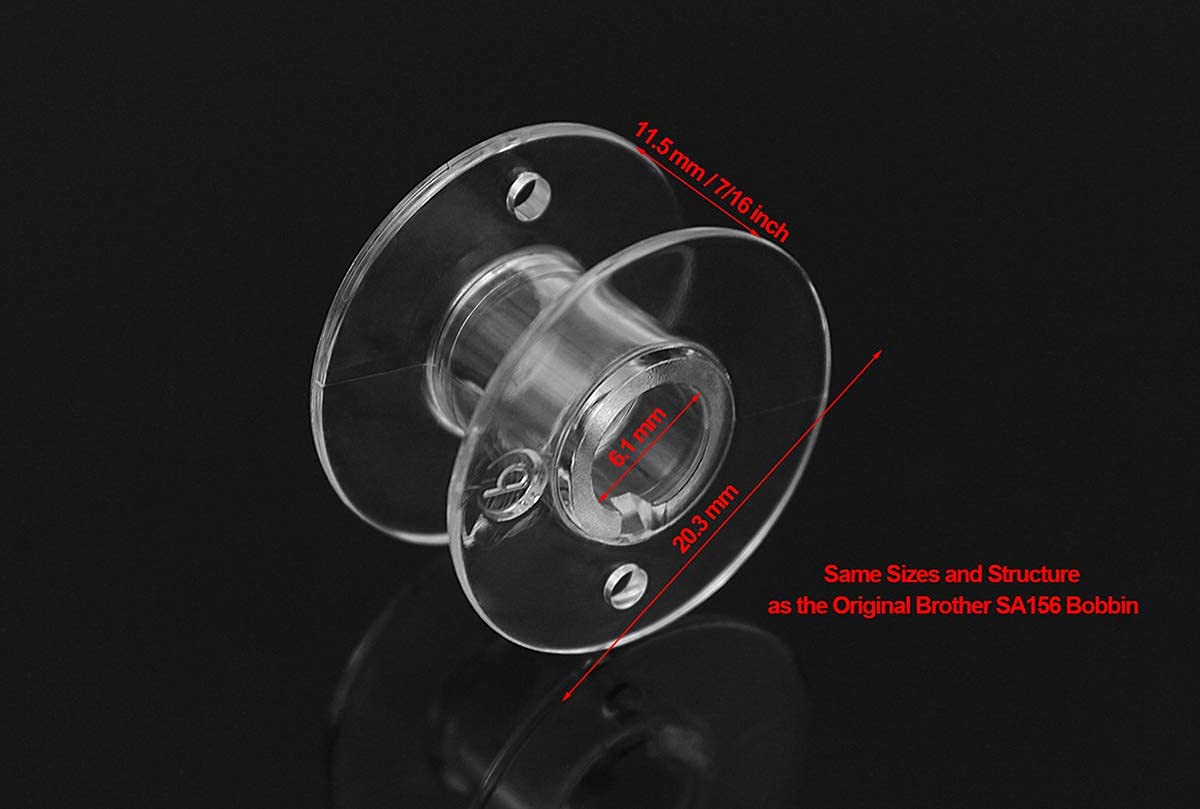 Product Features1. Every sewing or embroidery machine has its own suitable bobbins, these SA156 bobbins are specially manufactured for Brother sewing and embroidery machines that use class 15 bobbins (See your machine manual for bobbin size specification)2. 60pcs premium SA156 bobbins included, ideal for pre-winding your embroidery bobbin thread, or as extra sewing bobbins for winding sewing thread colors to suit your projects3. Sew Tech SA156 bobbins have exactly the same sizes as the original Class 15 Brother SA156 bobbins: outer diameter: 20.3mm, inner diameter: 6.1mm, height: 11.5mm (7/16 inch)4. These transparent plastic bobbins allow you to clearly see when your bobbin thread is about to run out5. Sew Tech bobbins are accurate and super durable for your long-term daily use6. Brother has two types of plastic bobbins: SA155, SA156. These SA156 bobbins fit most Brother sewing machines, quilting machines and embroidery machines, including Brother XM2701 CS6000i CS7000i GX37 XR3774 CS5055PRW XR9550PRW HC1850 CS8800PRW PE800 PE770 SE600 SE625 SE400 SE425 SE1900 PE550D PE535 LB5000S/M Innovis NQ1600E NQ1400E, etc. Packing List1 Bag including 60pcs Bobbins: SA156 / SFB (XA5539-151) - Class 15 Type, 11.5mm (7/16 inches) in Height About Sew TechSew Tech, dedicated in the Sewing and Embroidery industry for more than 10 years, has provided millions of thousands of embroidery hoops, presser feet, bobbins and other sewing tools and accessories to the customers all around the world. With high quality products and warm service, Sew Tech get highly recommendation worldwide, and will help you to Be Your Own Fashion Designer.