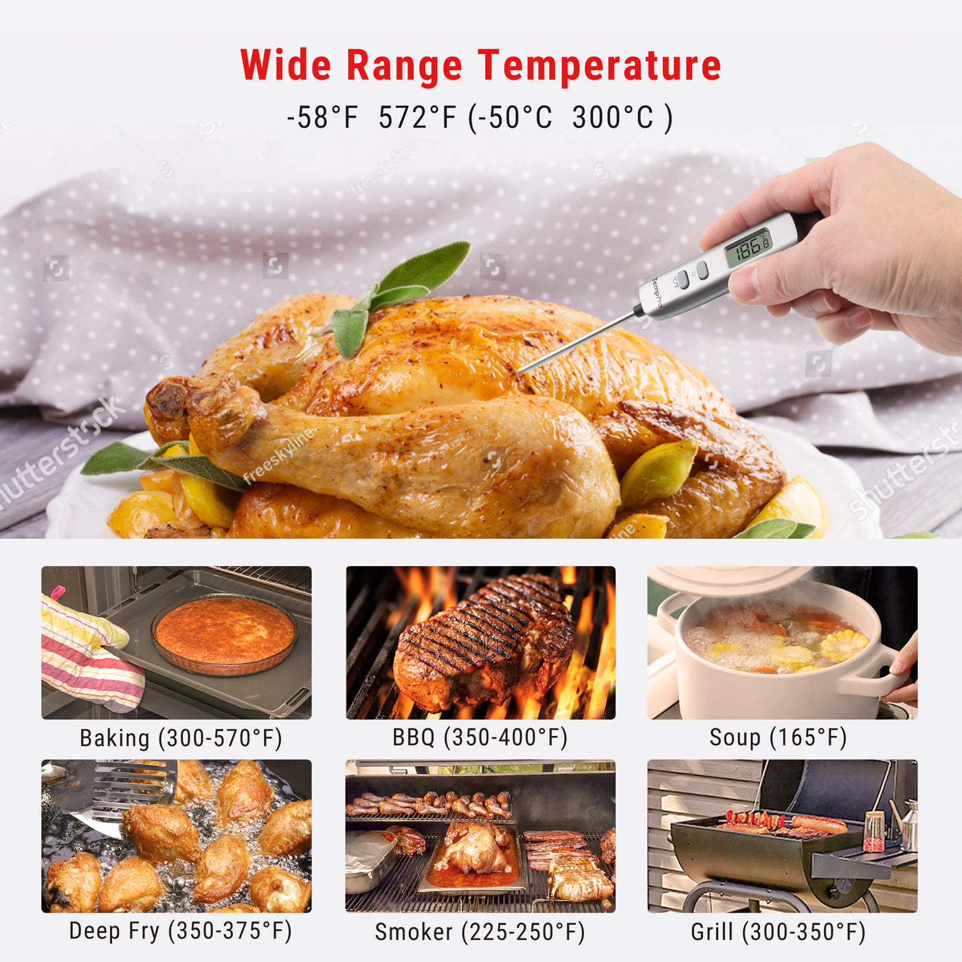- Wide Range of Use: Smoker thermometer measure the temp in a wide range of -58F to 572F, make the digital food thermometer fit for every cooking situation like: grilling, smoker, BBQ, candy, deep frying, oven and baking