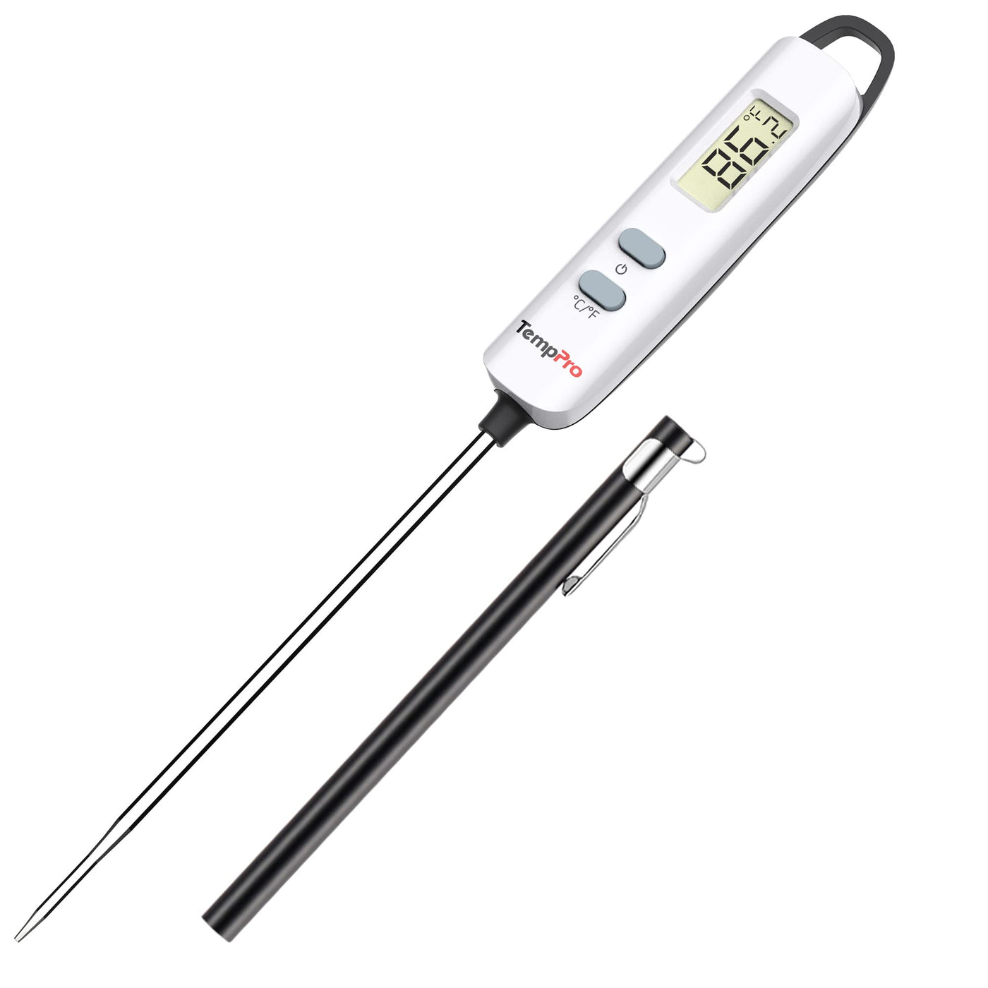 TempPro E16 Digital Meat Thermometer with ProbeInstant Read and High AccuracyTempPro probe thermometer features a 3 to 5 second readout speed and high accuracy of ±1.8?, ensuring you get the exact temperature for your delicious food.4.72 Inches Ultra Long ProbeEquip with super long probe, make the meat thermometer for oven measure the temp safely, and the probe cover could be used as a holder to help you stay away from heat.Easy to Use DesignDigital candy thermometer have clearly LCD display, easy to read at a glance; press the button to switch the temp unit simply; slim body and the kitchen hook allow you to store it anywhere, also the probe cover will protect the probe from drop and more secure when storeSpecification:Probe length: 4.72 inchesTemperature Accuracy: ±1.8? (±1?)Temperature Range: -58? to 572?Temperature Unit: ? and ? switchableDisplay: Clearly LCD ScreenAuto Off: 10 minsPackage Contents:1 x Meat thermometer1 x LLR4 battery1 x Manual