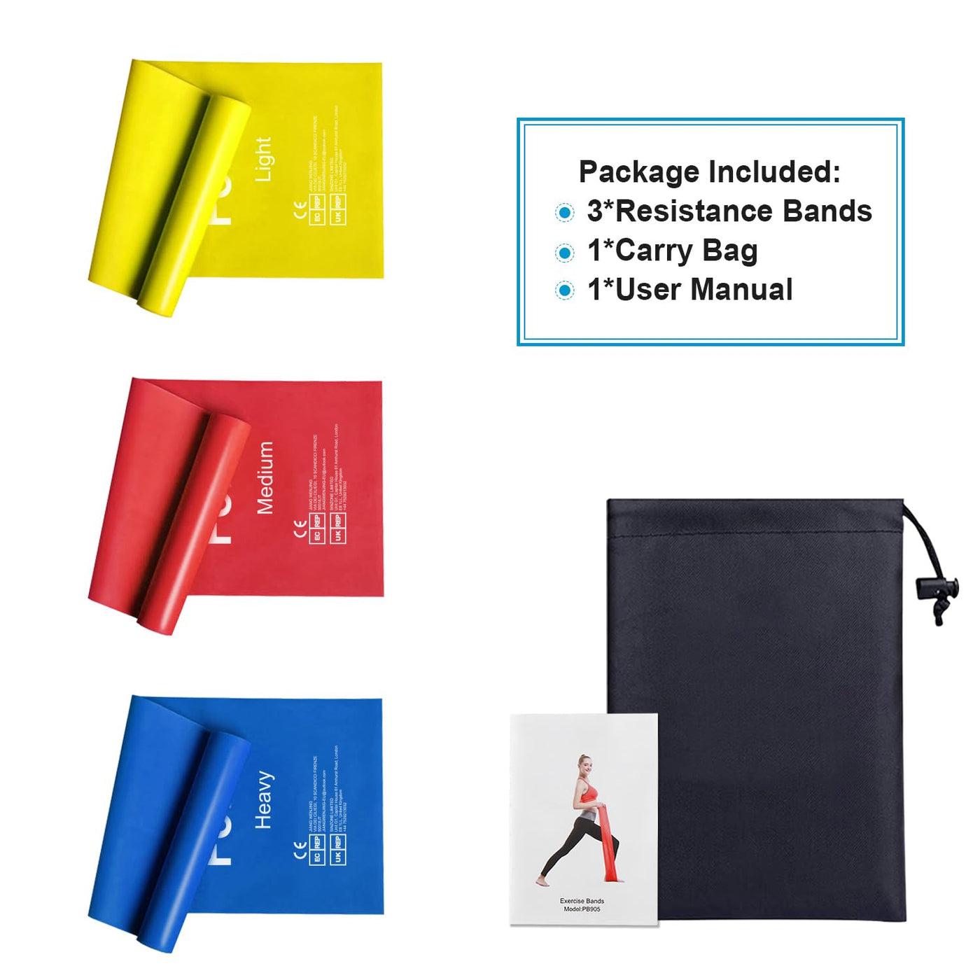 If you're after If you are looking for a way to train all muscle groups at the desired intensity at home or from anywhere, then resistance bands are the perfect choice for you. Features: ‚úÖ Ideal for fitness exercises such as Pilates, yoga, gymnastics, Crossfit, stretching, ‚úÖ The three perfectly coordinated bands allow you to train your entire body in a targeted manner. ‚úÖ The natural latex material ensures even tension, high elasticity, good tear resistance and wear resistance. Non-toxic and odorless. Make your training even more pleasant and effective 3 different levels ‚úÆ LIGHT (yellow) / 200 cm x 15 cm x 0.35 mm: Resistance 6.8 kg for light training, warm-up and stretching. ‚ñ∑ Medium (red) / 200cm x 15cm x 0.45mm: resistance 9kg, suitable for most exercises. Heavy Duty (Blue) / 200cm x 15cm x 0.55mm: Resistance 11.3kg for stronger exercises, ideal for legs and heavy upper body exercises. Tips: 1. If you don't use it for a long time, you can put it in a bag of the package, put it in a cool place, avoid exposure to sunlight. 2. Do not stay close to the heat source (underfloor heating, oven) for a long time to prevent the tension strap from aging. Our customer service We offer a 24 month guarantee. If you are not satisfied with the product or there are any quality problems with the products, please contact us. We offer you a solution that will satisfy you. Box contents: 3 x gymnastics (easy/medium/heavy). 1 x Drawstring Bag 1 x User Manual (may not be in English). 1 x Warranty Card