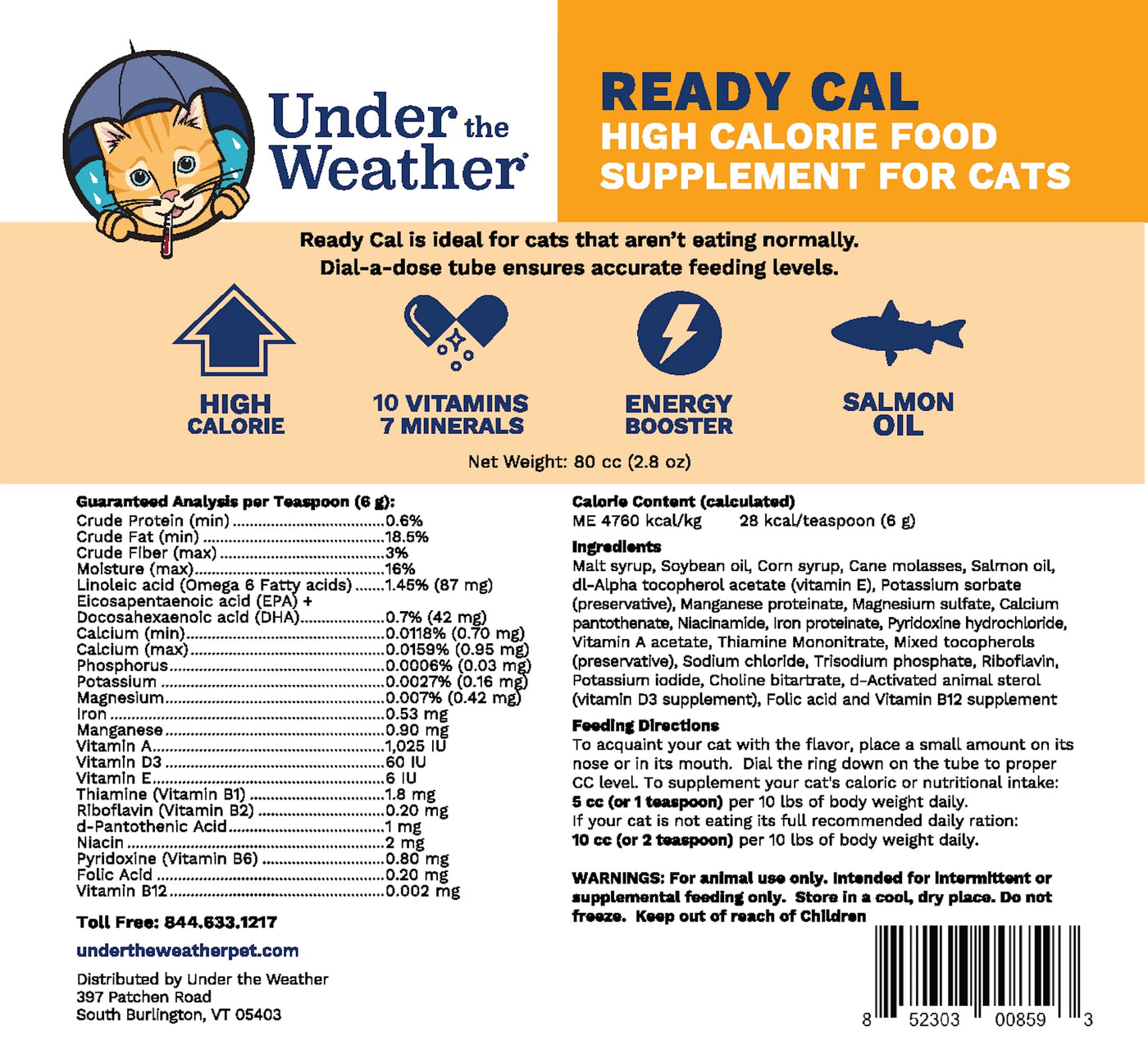 Under the Weather Pet | Ready Cal for Cats 100cc | High Calorie Nutritional Supplement for Weight Gain & Not Eating | 10 Vitamins, 7 Minerals, Omega Fatty Acids