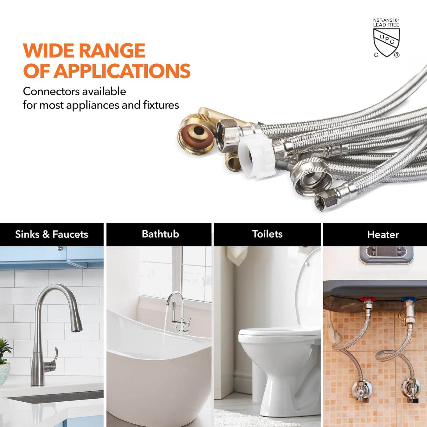 - [LEAD-FREE] All braided water connectors and parts are 100% NSF 61 compliant for safe drinking water and NSF 372 compliant, ensuring lead-free performance.