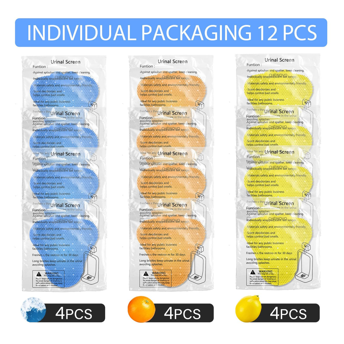 - Effectively Cleans & Deodorizes: Urinal screen deodorizer is a great idea to hide the urine smell and keep bathroom clean. Total 24 pack urinal screens and EACH urinal screen mats is individually packaged in bulk, 8 pack urinal screen pads of blue ocean scent, 8 pack of orange citrus scent, and 8 pack of yellow lemon scent.