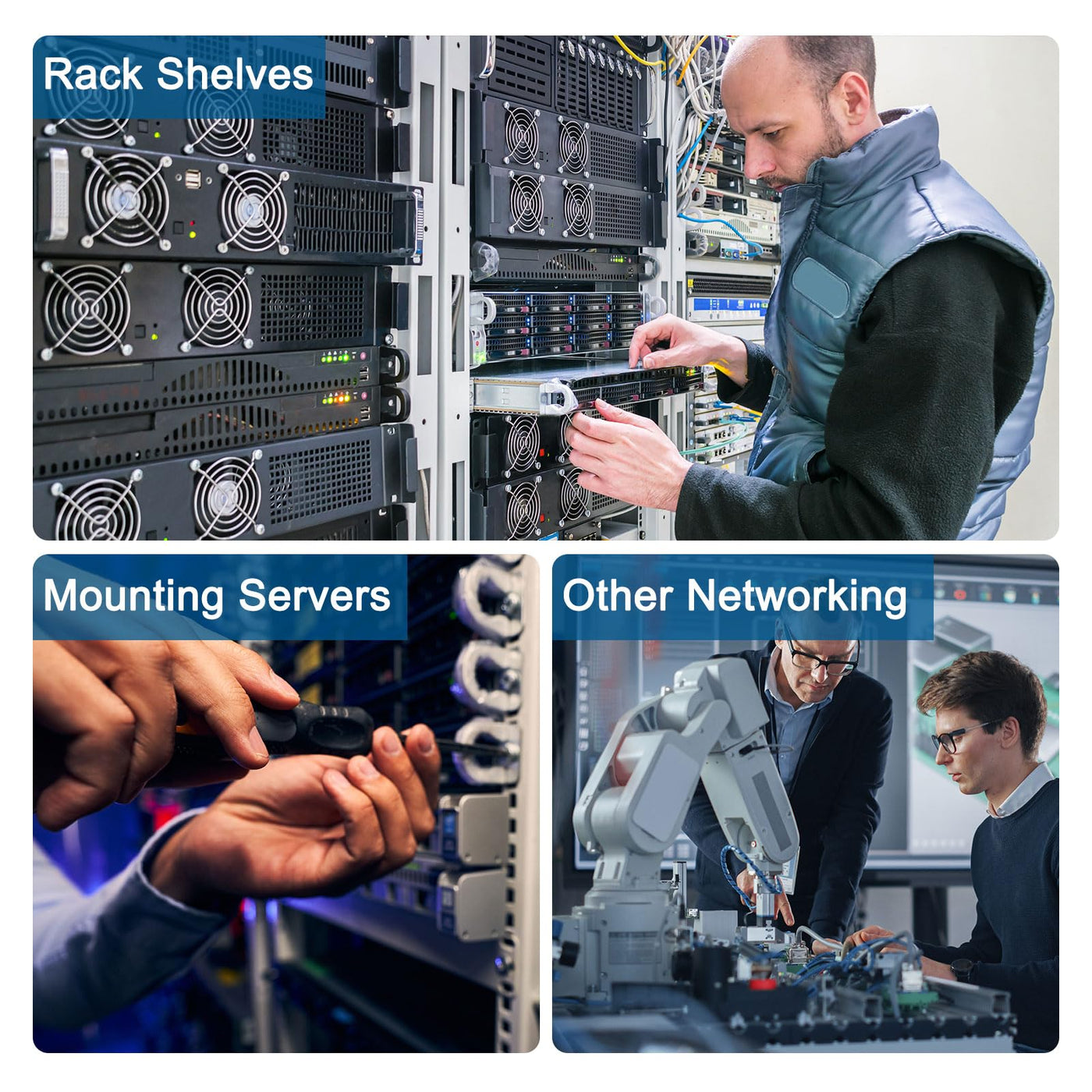 - [Application] Used for mounting servers, rack shelves, switches, routers, and other networking, electronic, and data equipment.